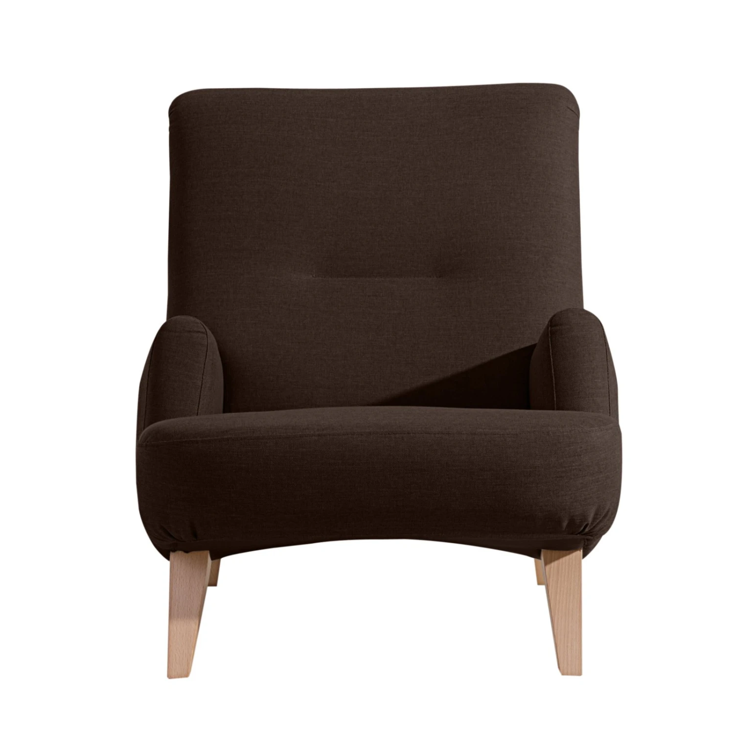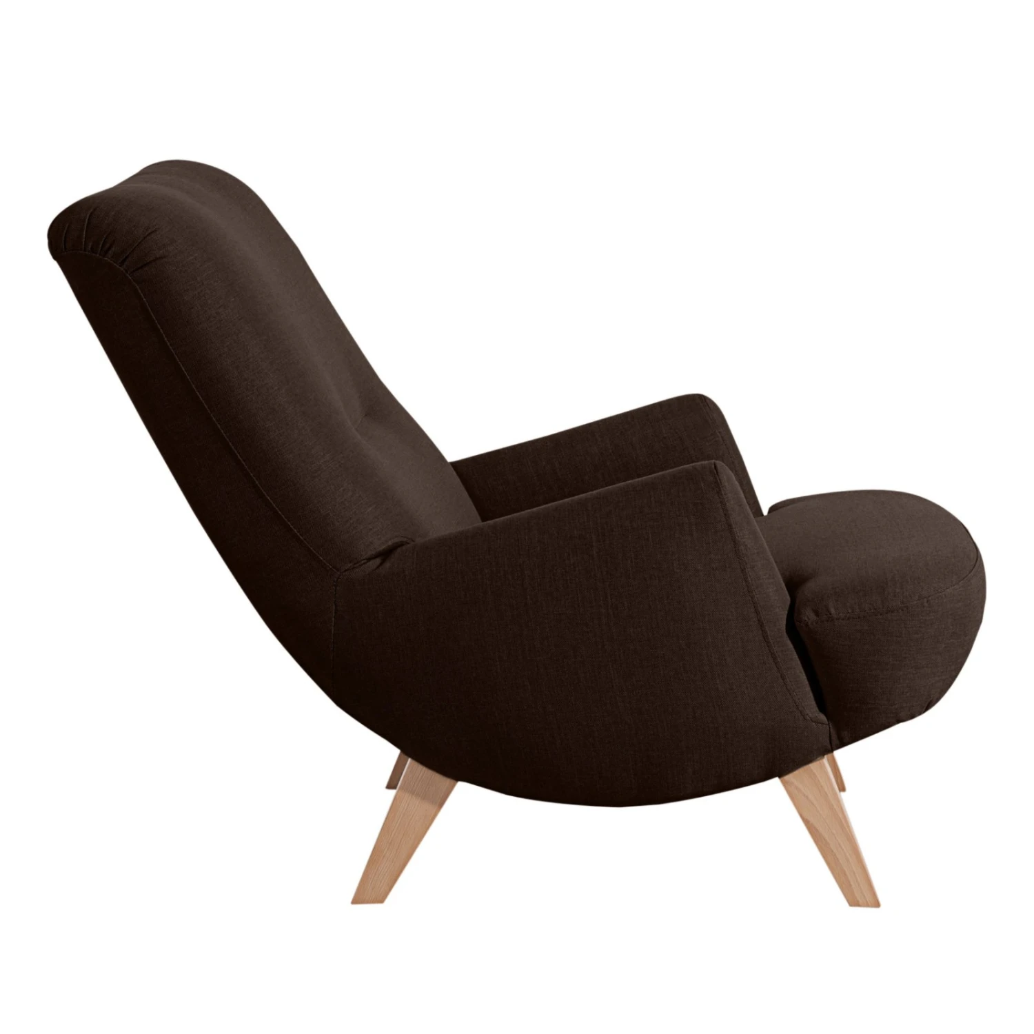 Gemütlicher Sessel in toller Retro-Optik. Hier wird der moderne schokofarbene Bezug in Leinenoptik mit massiven Füßen in Buche natur und einem außergewöhnlichen Design kombiniert. So wird der Sessel in Ihren vier Wänden zum Hingucker. Für Gemütlichkeit ist dank Wellenunterfederung und Polyätherschaum gesorgt. Durch die nach hinten abfallende Sitzfläche können Sie komfortabel Relaxen und schöne Stunden genießen.