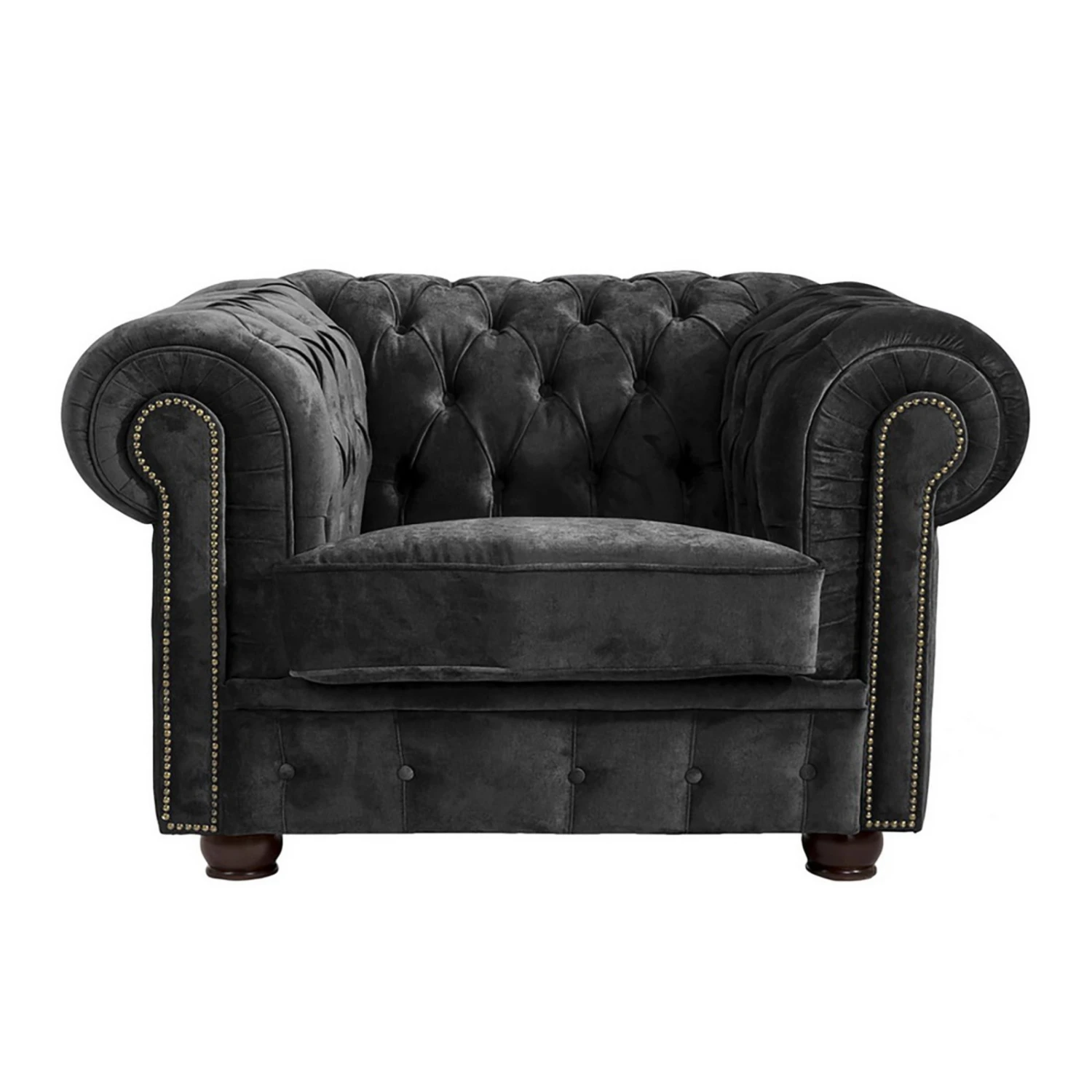 Dekorativ und komfortabel ist dieser Sessel mit seiner aufwändigen Knopfheftung an Rücken, Armlehnen und Sitzleiste. Der Cheserfielstil findet sich nicht nur in der Bearbeitung des schwarzen Bezugs, sondern auch bei dem losen Sitzkissen wieder, welches mit formstabilem Polyätherschaum gefüllt ist. Als optisches Highlight sind die Armlehnen zusätzlich mit einem Ziernagelband versehen, welches in Kombination mit den gedrechselten Massivholzfüßen eine abgerundete Erscheinung ergibt. Holen Sie sich den englischen Charme in Ihre vier Wände.