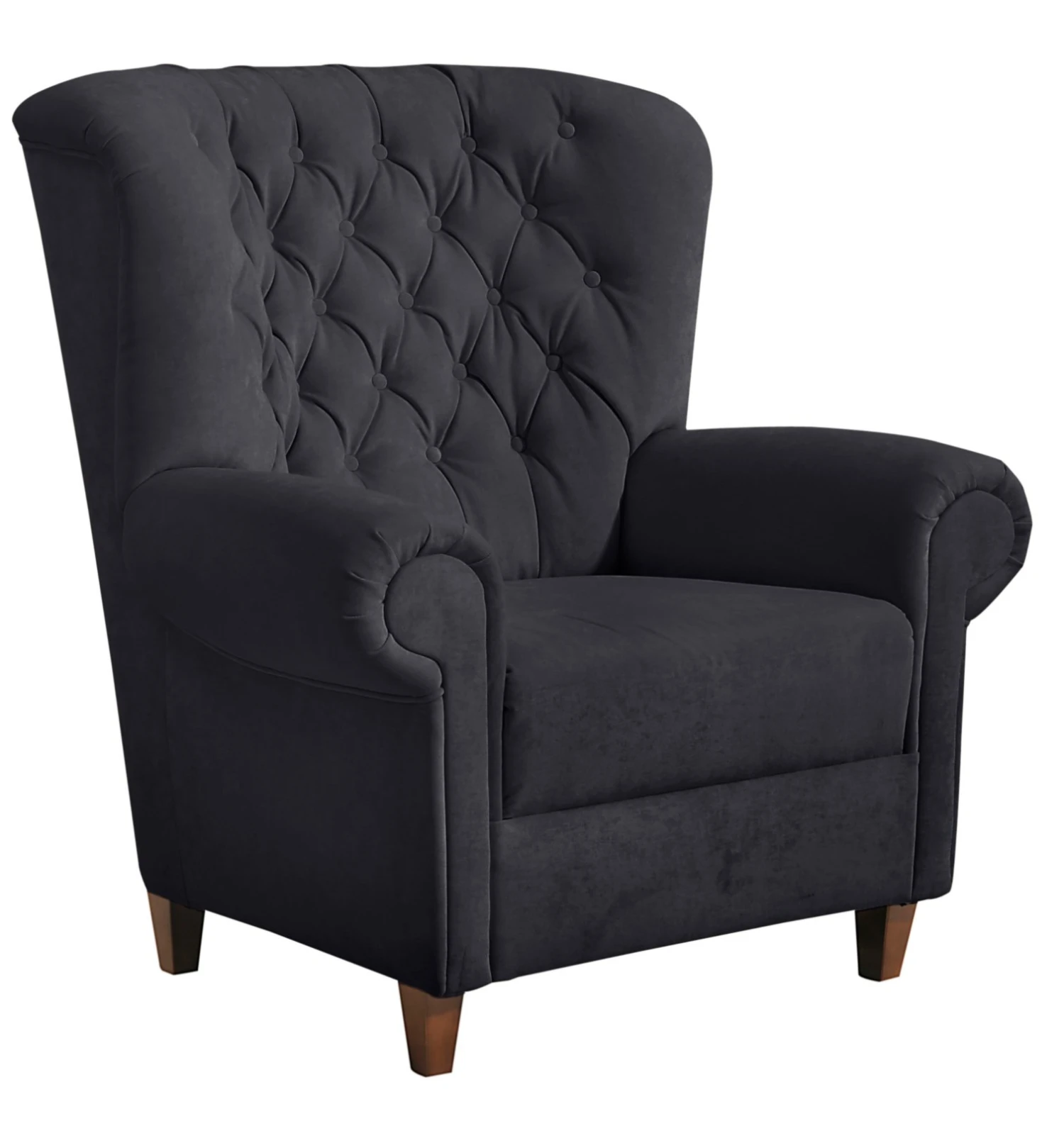 Stilvoller Hochlehnsessel mit charakteristischer Knopfheftung im Rücken in Schwarz überzeugt durch seine wunderschöne Optik. Seine liebevollen Details und die aufwändige handwerkliche Verarbeitung machen ihn zum Blickfang in jedem Raum. Die Füße sind zur einfachen Selbstmontage. Der Sessel hat eine optimale Sitzhöhe von 44 cm.