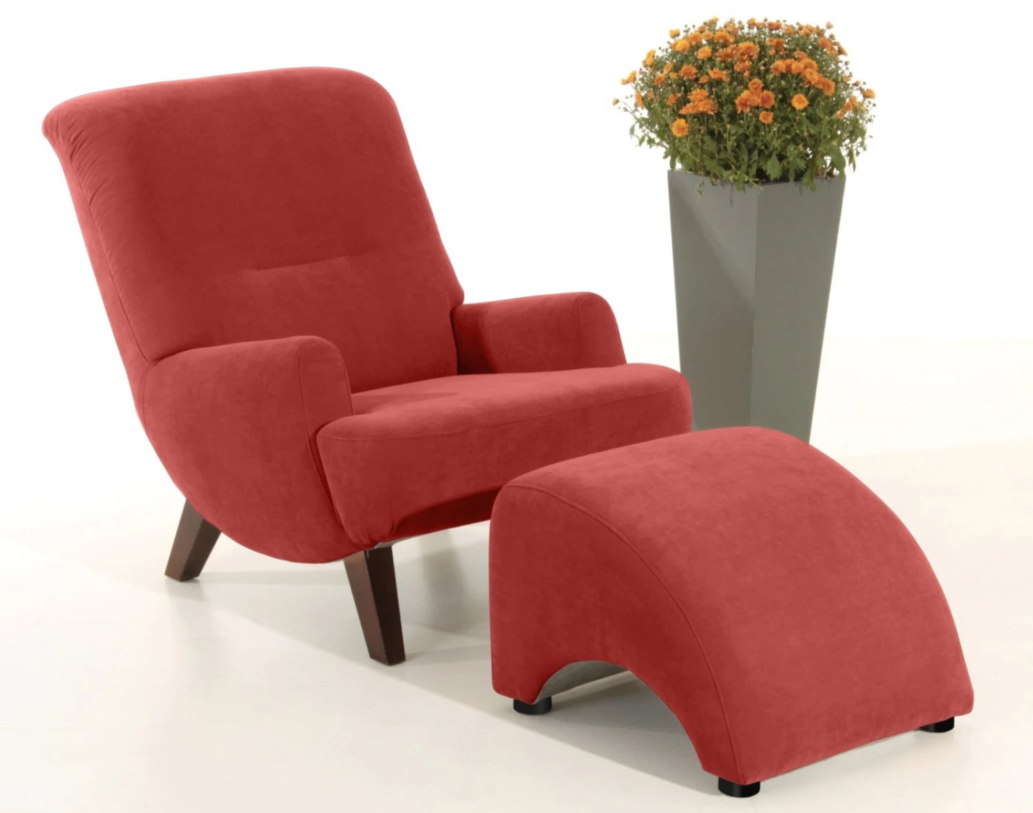 Flauschig weich lädt dieser Sessel zum Verweilen ein. Der Bezug in Terracotta ist aus Veloursstoff, der sich durch seinen hohen Flor samtig anfühlt. Der Sessel ist rundherum damit bezogen, so dass Sie ihn auch mitten im Raum platzieren können. Die Füße aus massivem Buchenholz sind in edlem dunklen Nussbaum gehalten und verleihen dem Sessel einen Retro-Look. Genießen Sie gemütliche Stunden auf einer Wellenunterfederung, die mit atmungsaktivem Polyätherschaum gepolstert ist.