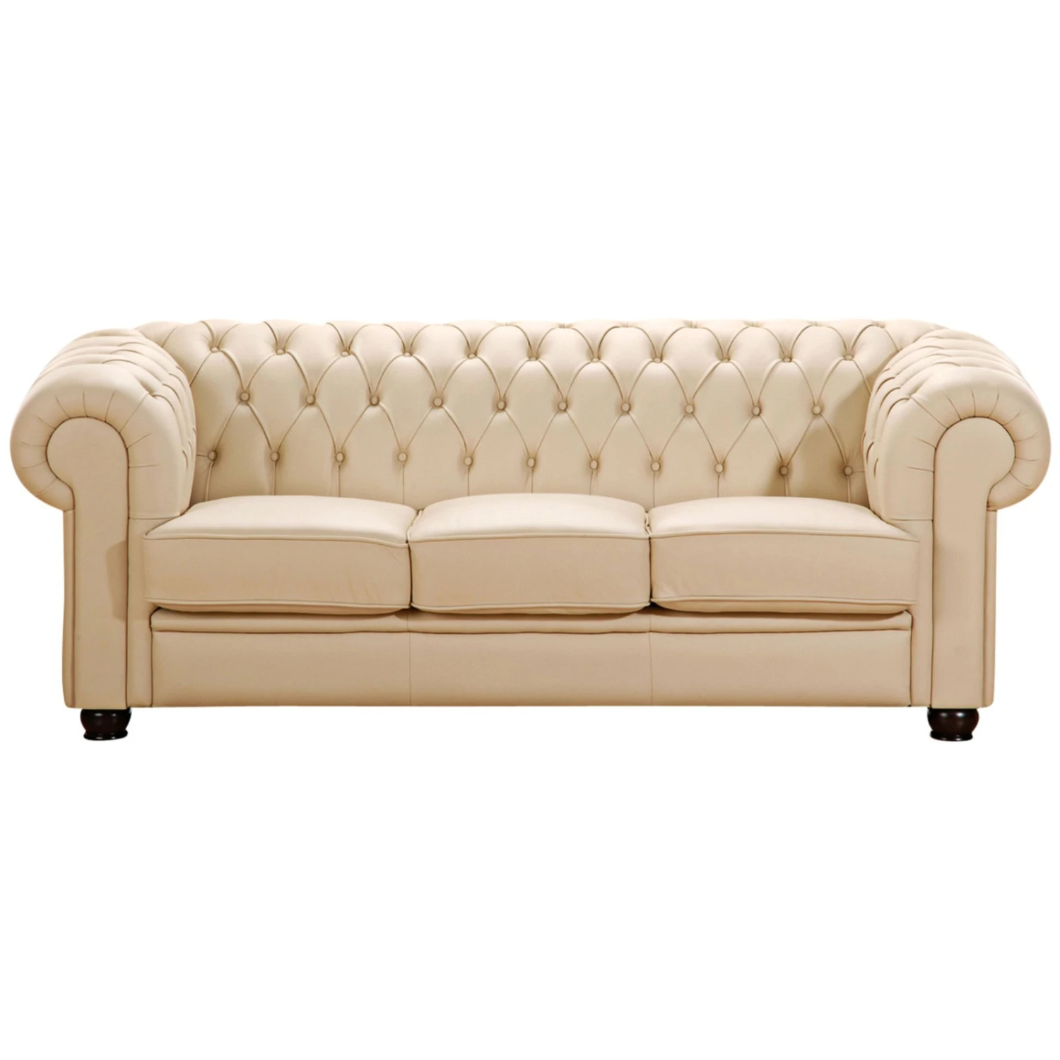 Dieses wunderschöne Sofa holt den englischen Chesterfield Stil in Ihr Wohnzimmer. Mit handwerklicher Wertarbeit wurden die aufwändigen Knopfheftungen im Rücken und den geschwungenen Armlehnen gefertigt. Dieses Sofa in Beige überzeugt durch seine Optik. Gearbeitet mit viel Liebe zum Detail erhält dieses Sofa seinen markanten, unverwechselbaren Look. Auch die Rückseite ist mit Leder bezogen, damit ist das Sofa frei im Raum stellbar. Ein echter Klassiker! Die Füße sind zur einfachen Selbstmontage. Das Sofa hat eine optimale Sitzhöhe von 44 cm.