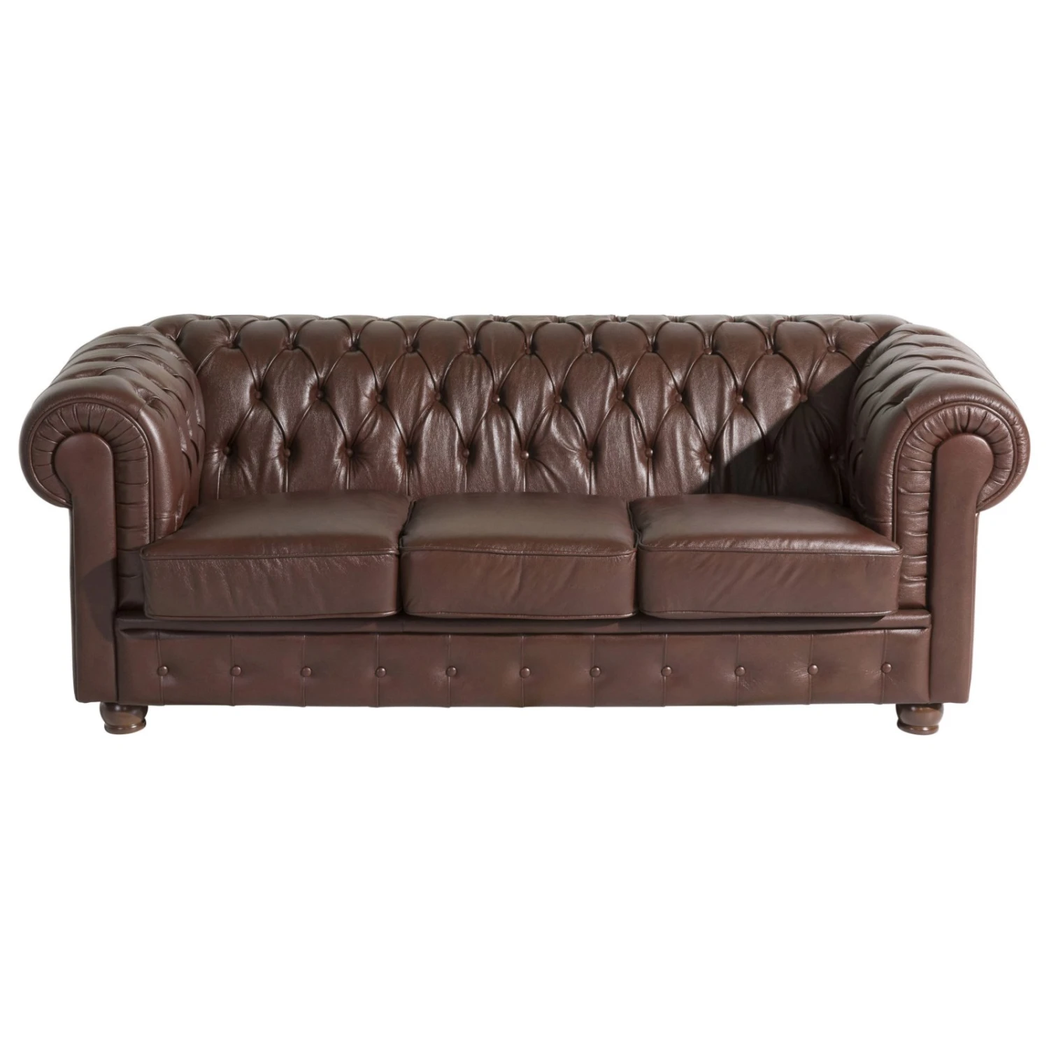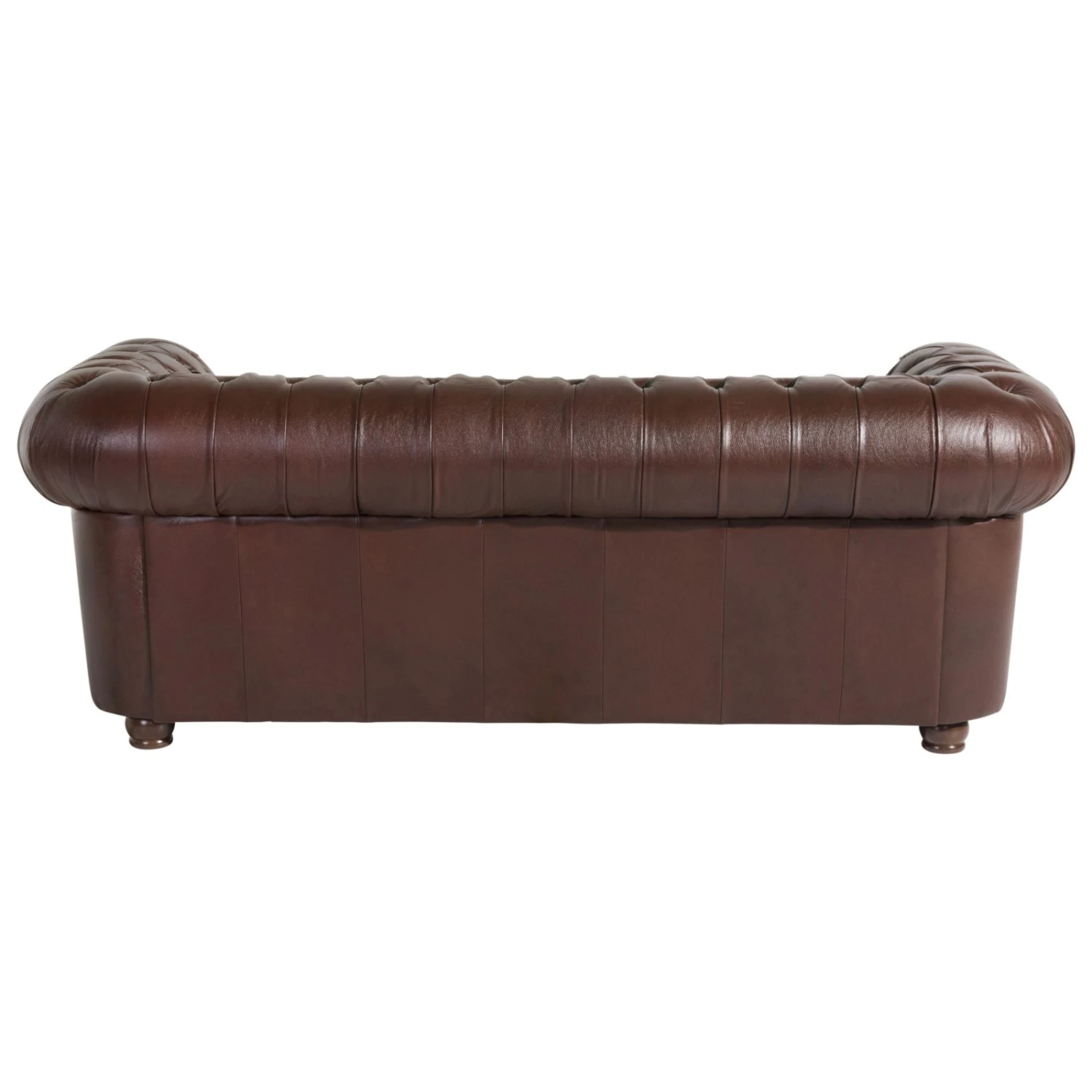 Dieses Sofa holt den englischen Chesterfield Stil in Ihr Wohnzimmer. Mit handwerklicher Wertarbeit wurden die aufwändigen Knopfheftungen im Rücken, an der Sitzrampe und den geschwungenen Armlehnen gefertigt. Dieses Sofa in Braun überzeugt durch seine Optik. Gearbeitet mit viel Liebe zum Detail erhält dieses Sofa seinen markanten, unverwechselbaren Look. Auch die Rückseite ist original bezogen und ebenso verarbeitet, damit ist das Sofa frei im Raum stellbar.