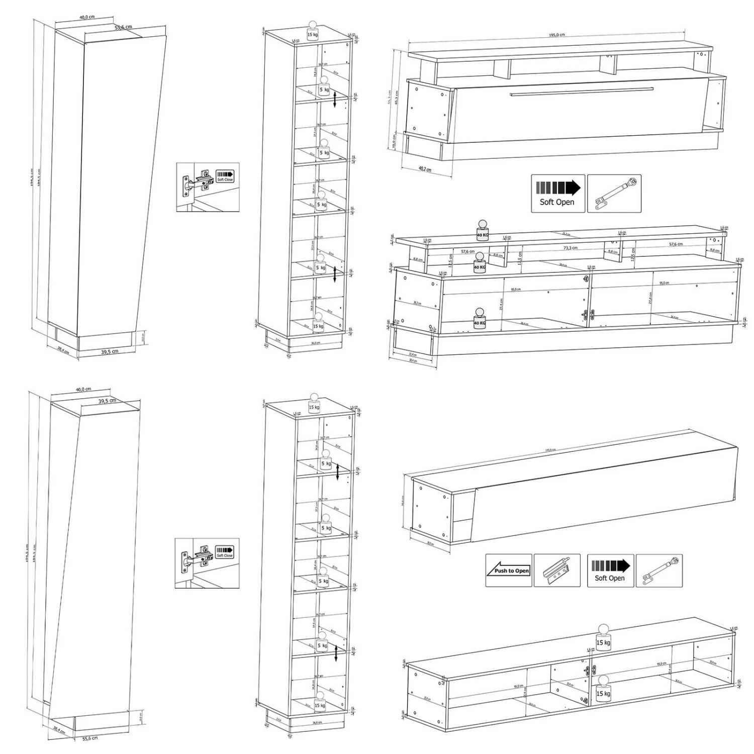 Die etwa 275 Zentimeter breite Medienwand wird in Ihrem Wohnraum für den höchsten Maß an Modernität sorgen und kann zudem mit viel Stauraum punkten. Der hochglänzende Ordnungshüter in Weiß und mit schwarzen Absätzen ist mit zwei Türen und zwei Klappen ausgestattet, die allesamt mit Dämpfern ausgestattet sind. Mittig dieser Medienwand ist Platz für einen bis zu 75“ großen Fernseher und für Ihr TV-Zubehör stehen Ihnen drei offene Gerätefächer zur Verfügung.