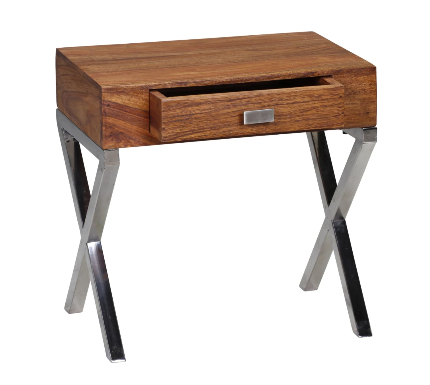 Modernes und massives Nachtkästchen mit einzigartiger Maserung und einer praktischen Schublade mit Griff. Die rechteckige Form harmoniert mit den elegant verchromten Standfüßen. Das massive Sheeshamholz des Korpusses ist braun gebeizt und in Handarbeit gefertigt. Ein einzigartiges Möbelstück – der Nachttisch, welcher bald neben Ihrem Bett stehen kann.