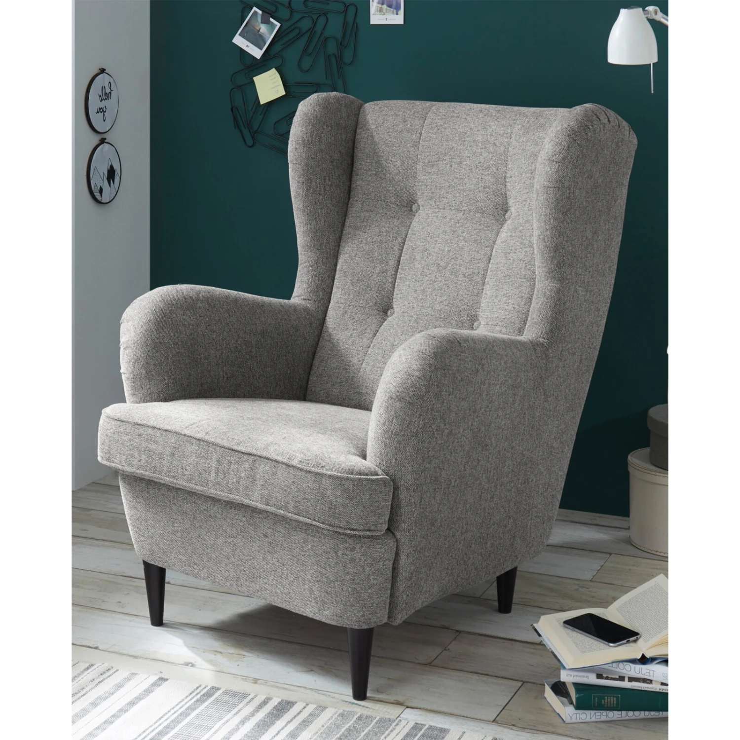 In diesem schönen Ohrensessel in Silber lassen sich stressige Tage entspannt ausklingen, egal ob Sie in ihm ein Buch lesen oder einfach nur relaxen möchten. Durch die Polsterung aus Nosagfedern im Sitz und dem Schaumstoff im Rücken genießen Sie einen hohen Komfort. Die schwarzen Füße aus Massivholz runden das Design zusätzlich ab. Da der Rücken mit dem Originalstoff bezogen ist, können Sie den Ohrensessel frei in Ihren Räumlichkeiten platzieren.