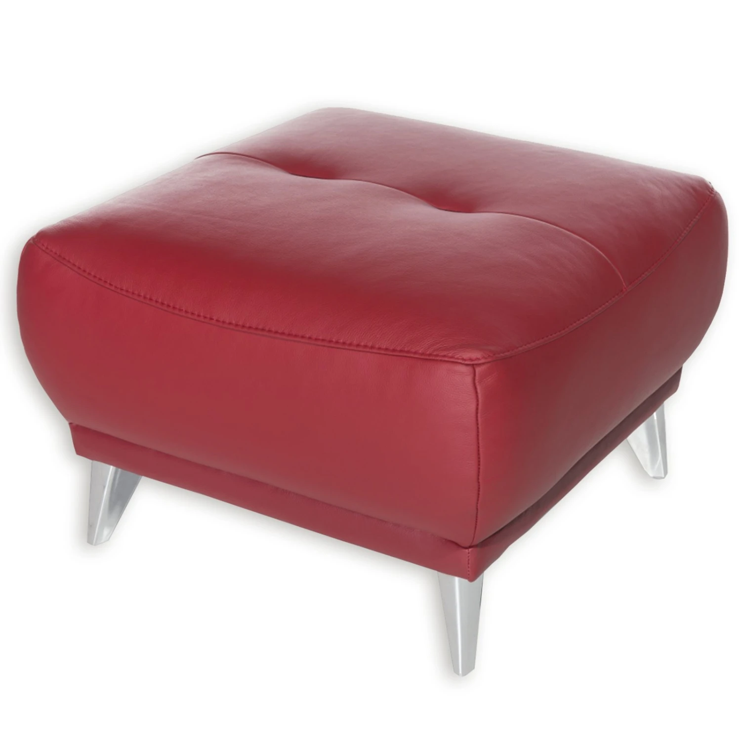Schicker Polsterhocker mit weichem Kunstlederbezug in modernem Rot. Durch den Bezug in Kombination zu den hohen und verchromten Metallfüßen sieht dieser Hocker besonders edel aus und peppt jedes Wohnzimmerdesign auf.