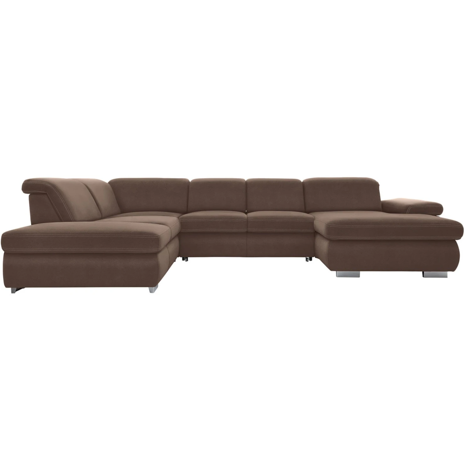 Mit dieser Boxspring-Wohnlandschaft in der Farbe Saddle braun bringen Sie frischen Wind in Ihr Wohnzimmer. Sein stillvolles und gleichzeitig zeitloses Design fügt sich bestens in viele Einrichtungsstile ein. Durch die Recamiere bietet sich genügend Platz zum Entspannen und Erholen. Die integrierte Sitztiefenverstellung ermöglicht eine komfortable Anpassung je nach individuellem Bedürfnis. Für zusätzlichen Komfort gibt es einen fest integrierten Anstellhocker. Die Sitz- und Rückenfläche sind mit einer Boxspringpolsterung sowie Kaltschaum gepolstert und zudem mit dem Originalstoff bezogen. Durch die Wellenunterfederung auf der Sitzfläche und elastische Polstergurte im Rücken wird ein bequemer Sitzkomfort gewährleistet.