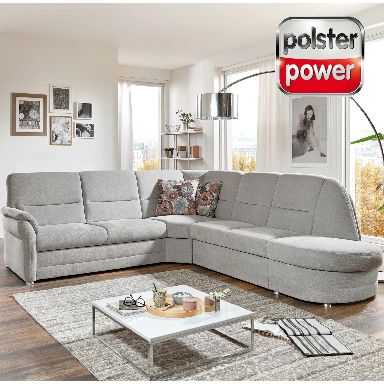 polsterpower Ecksofa – silber – Microchenille – Recamiere rechts