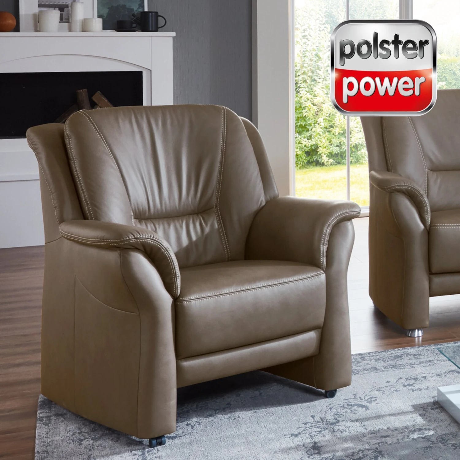 Dieser Sessel strahlt pure Gemütlichkeit aus. Durch die Federkern- und Kaltschaumpolsterung in Kombination mit der Wellenunterfederung ergibt sich ein bequemes Sitzbild. Zusätzlich sorgt die Federkern-Polsterung für eine gesunde Klimaregulierung. Der Bezug aus Echtleder überzeugt durch seine schlichte und gleichzeitig moderne Farbgebung und die beige Kontrastnaht setzt einen schönen optischen Akzent.