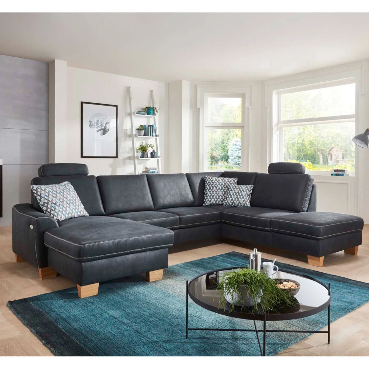 Nach einem stressigen Tag können Sie auf dieser 313 Zentimeter breiten Wohnlandschaft die Seele baumeln lassen und entspannen. Genießen Sie den hervorragenden Komfort und lassen Sie den Tag bei einem gemütlichen Fernsehabend ausklingen. Den tollen Sitzkomfort erlangt das Sofa durch den soften Sitz, der mit Kaltschaum gepolstert und mit Polstervlies ummantelt ist. Der denimfarbene Microfaser-Bezug wird von der beigefarbenen Kontrastnaht und den Holzfüßen in Eiche Bianco Nachbildung stimmig abgerundet und ergeben im Einklang ein wundervolles Gesamtbild.
