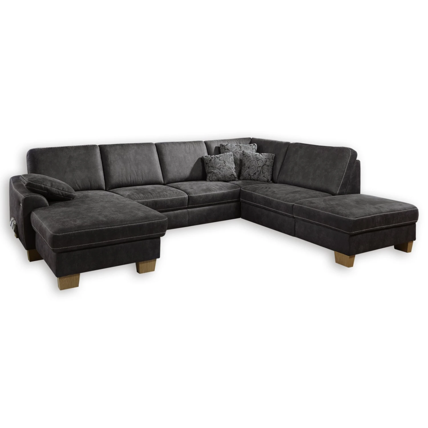 Diese schicke Wohnlandschaft ist mit angenehmer Microfaser in dunklem Grau bezogen. Eiche biancofarbene Füße fügen sich wunderschön in dieses Design ein. Die U-Form des Sofas mit einer Canapé mit Armlehne links, einem 2,5 Sitzer in der Mitte und einem 1,5 Sitzer mit Rückenlehne auf der rechten Seite bietet viel Platz um sich mal wieder richtig auszustrecken. Auf der Kaltschaumpolsterung sitzen Sie dabei so bequem und weich, dass Sie gerne lange verweilen werden.