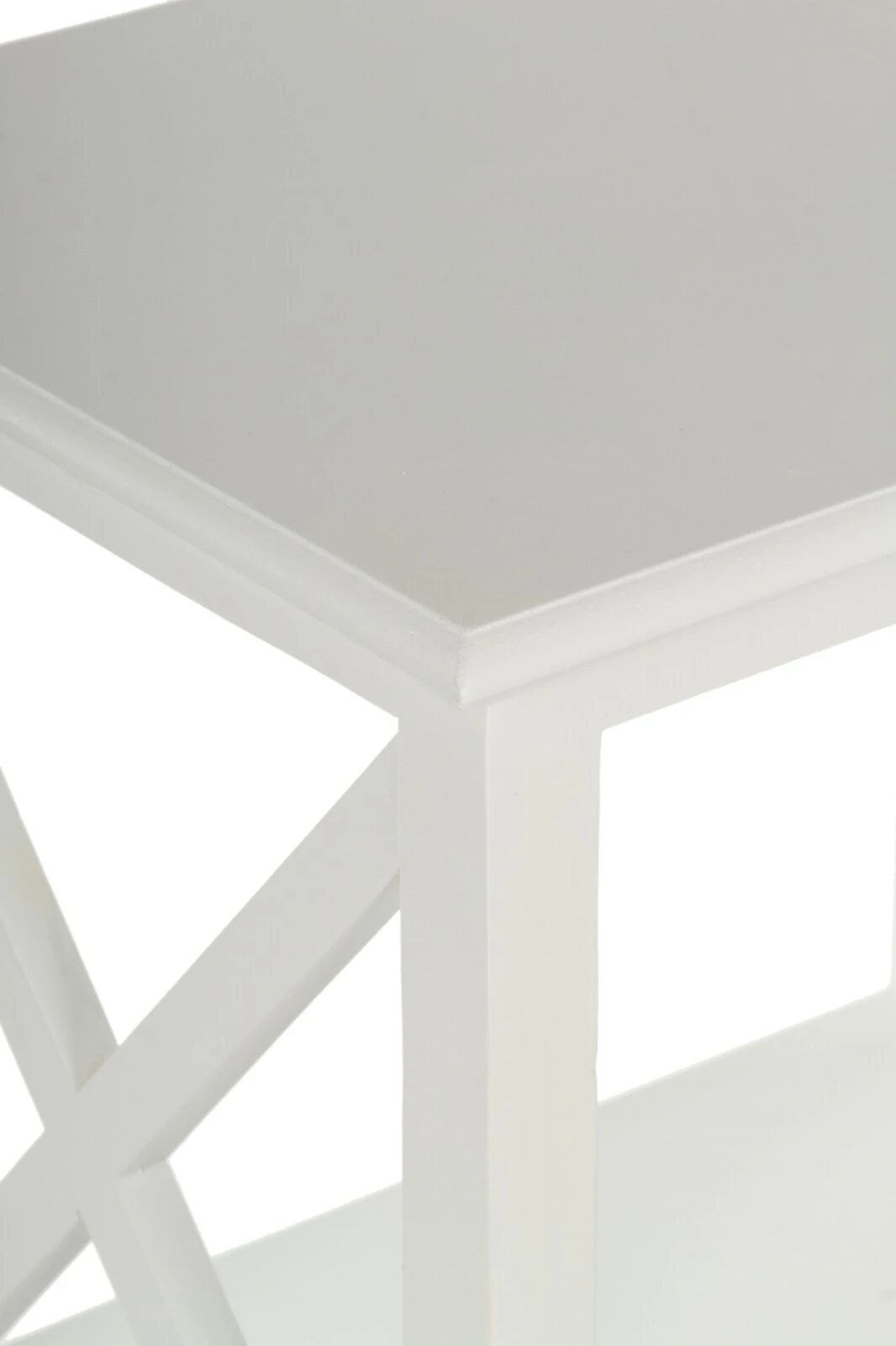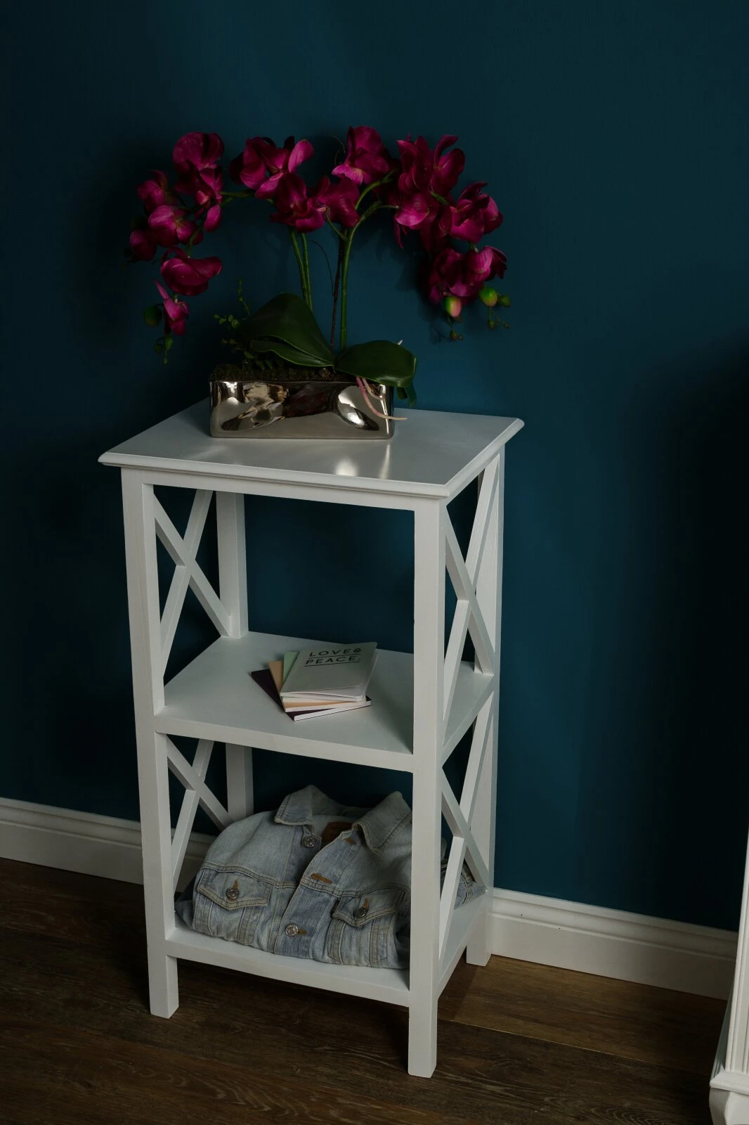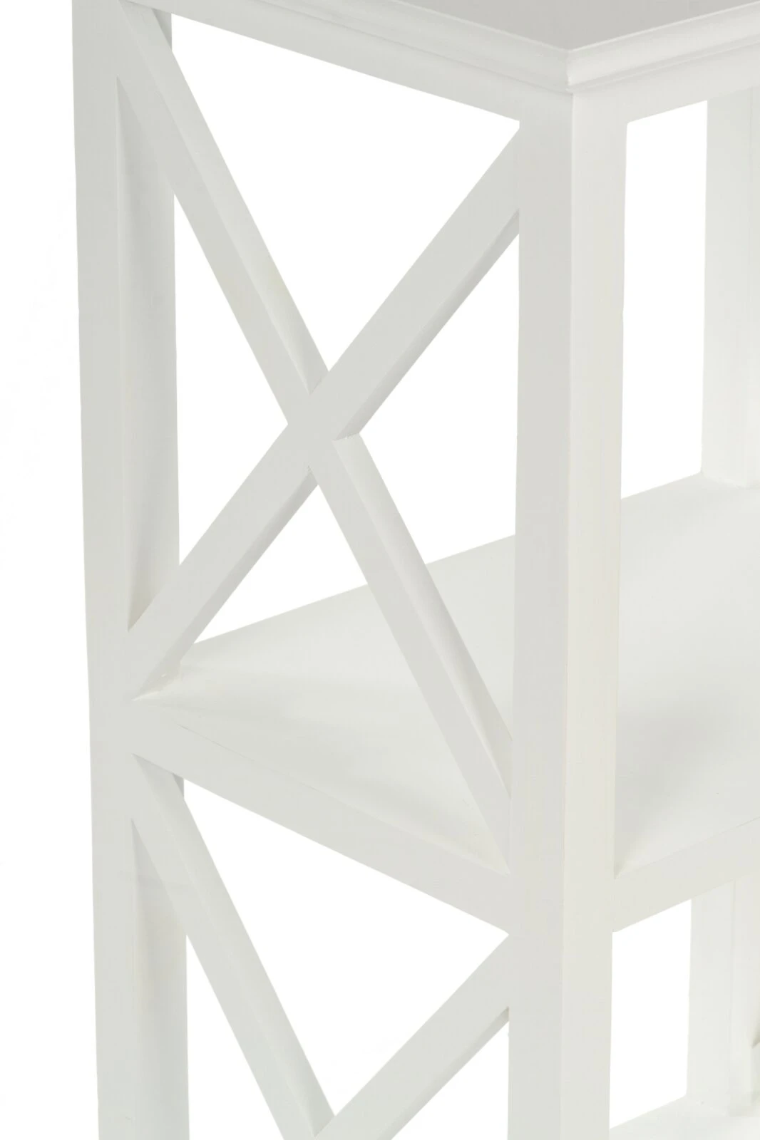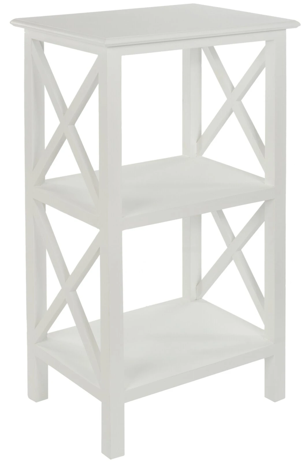 Wunderschönes weißes Regal im Landhausstil mit gekreuzten Streben in den Seitenteilen. Drei Ablagen bieten reichlich Platz für Ihre Utensilien.