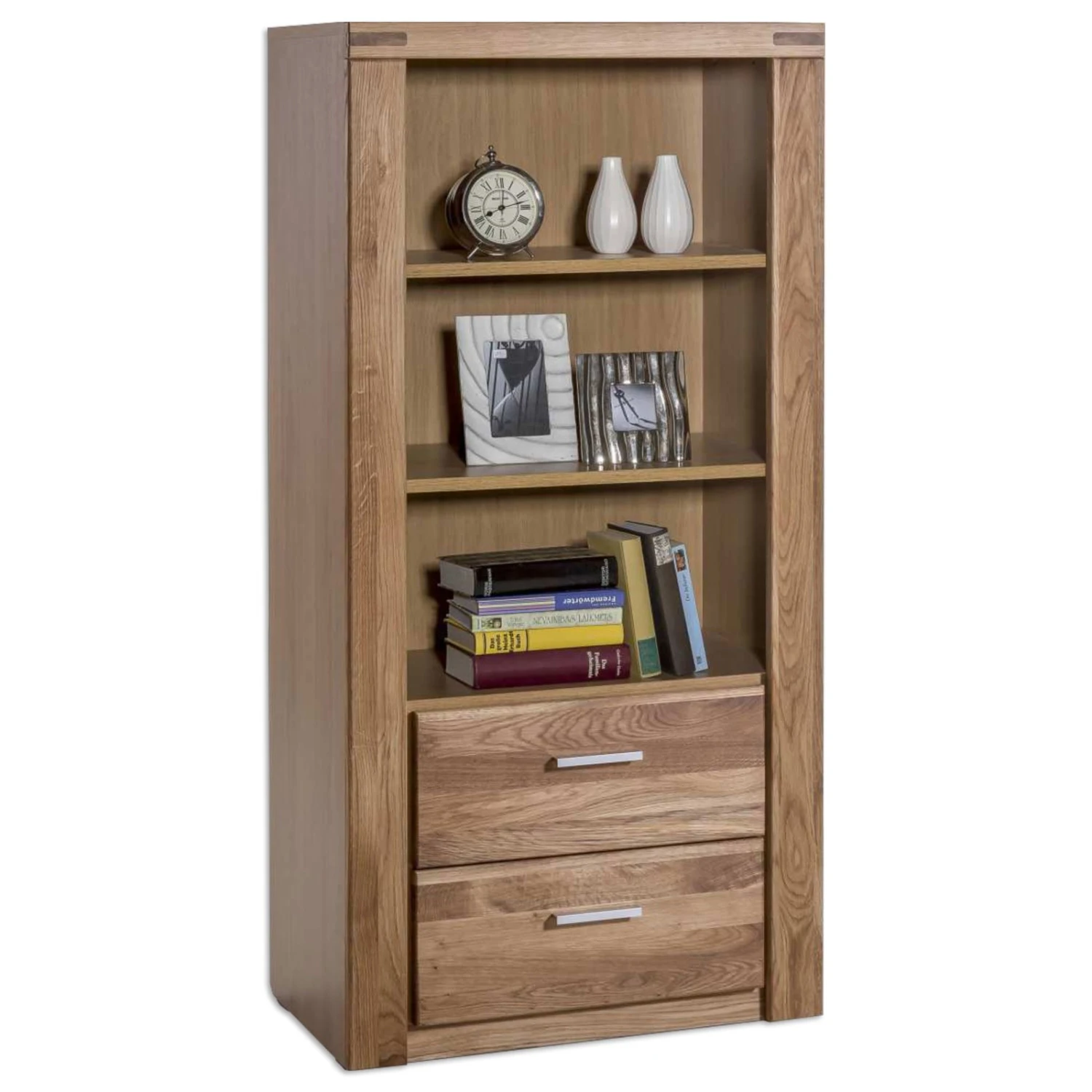 Das Standregal ist aus teilmassiver Wildeiche mit Griffen in Aluminium. Dies ergänzt sich stilvoll und wird Ihr Wohnzimmer um schönen Stauraum erweitern. Stellen Sie Ihre Lieblingsstücke in den drei offenen Fächern aus. In zwei Schubkästen können kleine Utensilien, wie Kerzen oder Servietten.