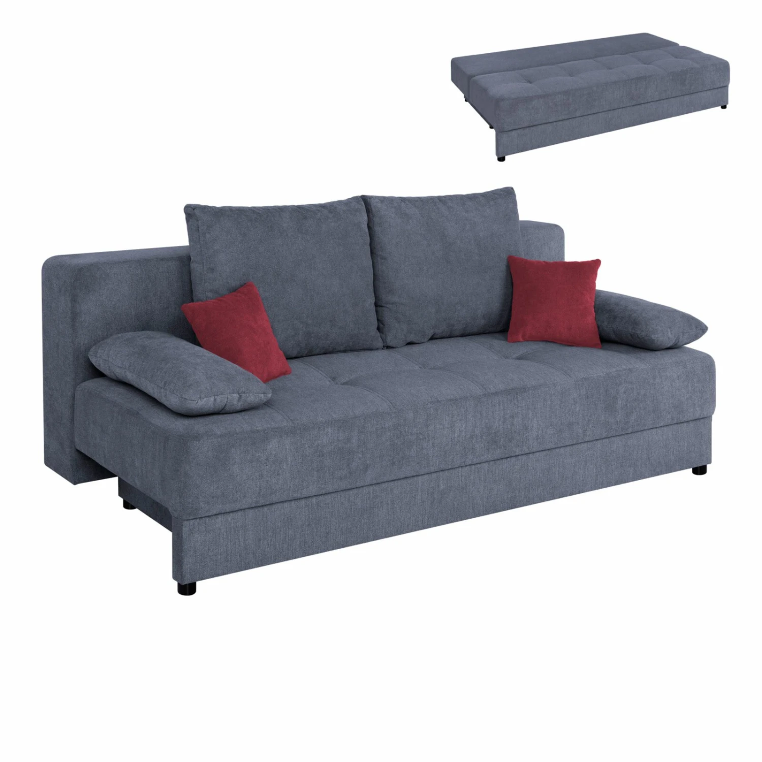 Dieses Schlafsofa mit Boxspringfederung ist ein echtes Funktionswunder. Es ist die ideale Lösung für Gäste, die bei Ihnen übernachten wollen, denn es ist mit einer Liegefunktion ausgestattet. Zudem besitzt dieses Schlafsofa ein Bettkasten, in dem Sie Decken und Kissen unterbringen können. Insgesamt sechs Kissen, wovon zwei Zierkissen in Berry für einen schönen Farbakzent sorgen, sind bereits im Lieferumfang enthalten und vervollständigen das Gesamtbild. Der Rücken ist mit dem Originalstoff bezogen, sodass Sie auch die Möglichkeit haben, dieses Sofa mittig des Raumes zu stellen.