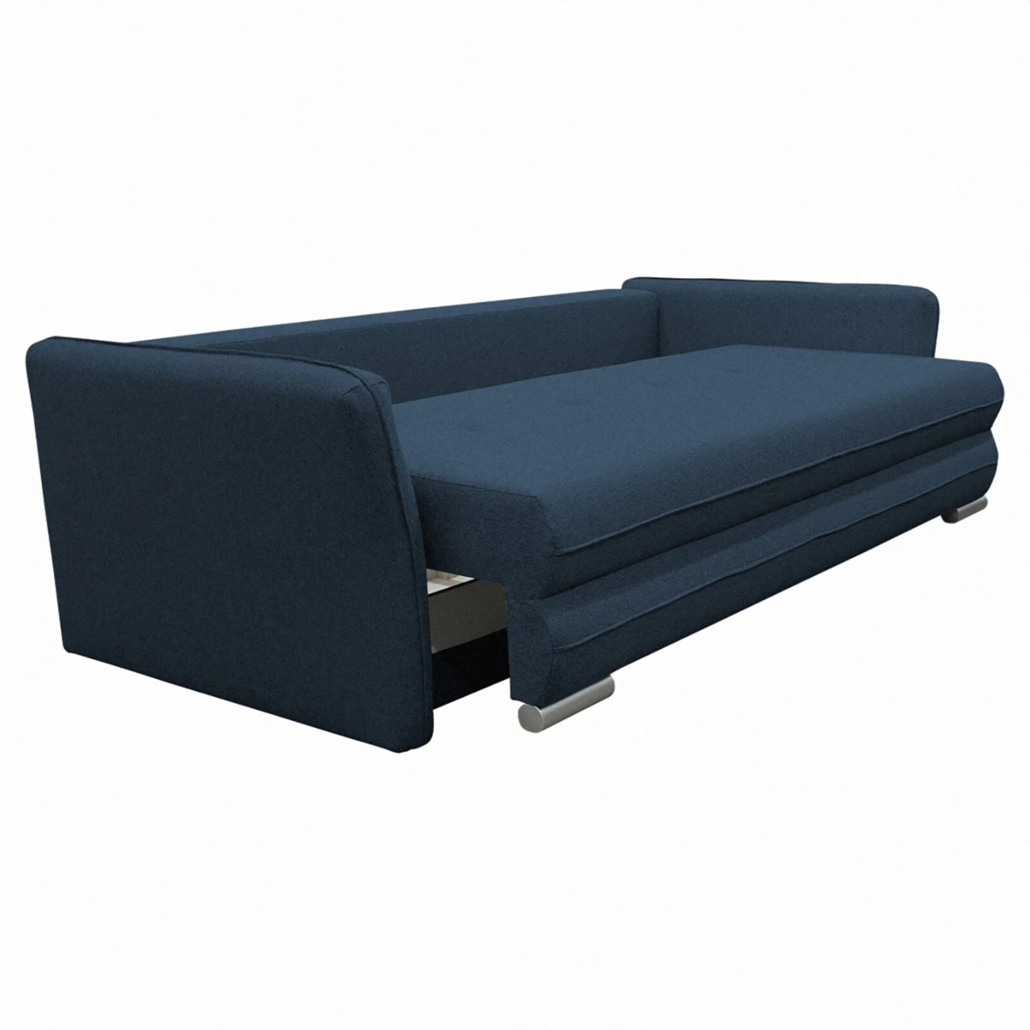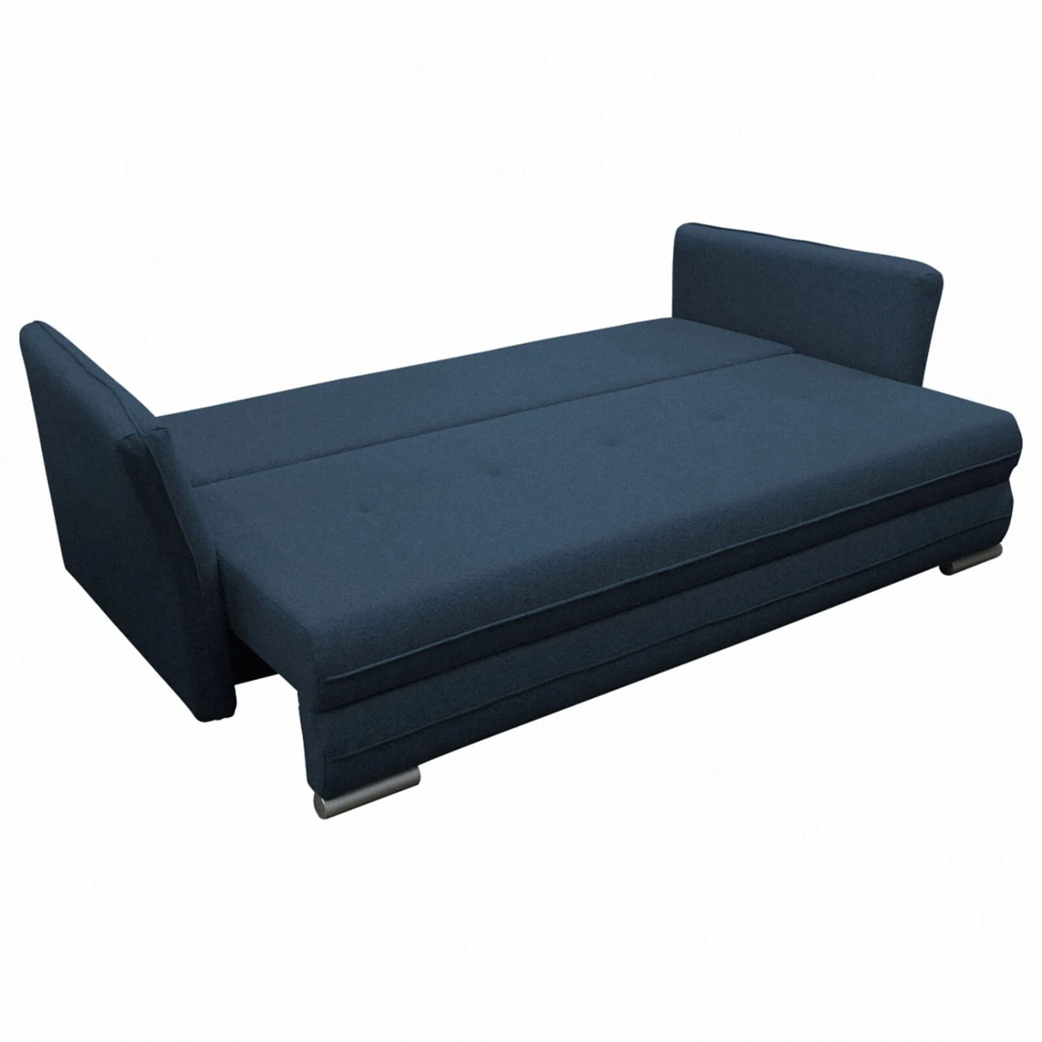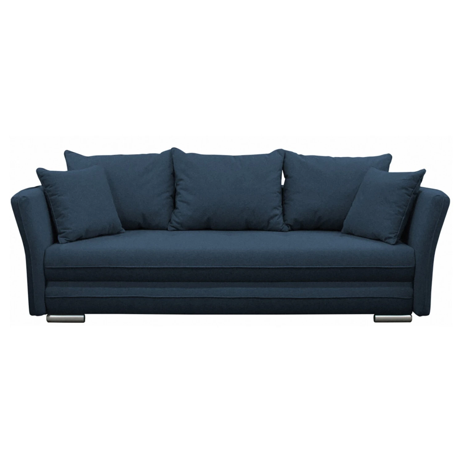 Dieses blaue Schlafsofa passt sich jedem Einrichtungsstil perfekt an. Durch die etwa 144 x 199 Zentimeter große Liegefläche lässt sich das Sofa kinderleicht in ein bequemes Bett für Übernachtungsgäste verwandeln. In dem Staukasten kannst du deine Tagesdecken und Kissen verstauen. Rücken- und Zierkissen sind bereits im Lieferumfang enthalten und sorgen zusätzlich für Gemütlichkeit. Abgerundet wir das schöne Design durch Kunststofffüße in Silber. Außerdem ist der Rücken im Originalstoff bezogen, so dass du das Schlafsofa auch frei im Raum platzieren kannst.