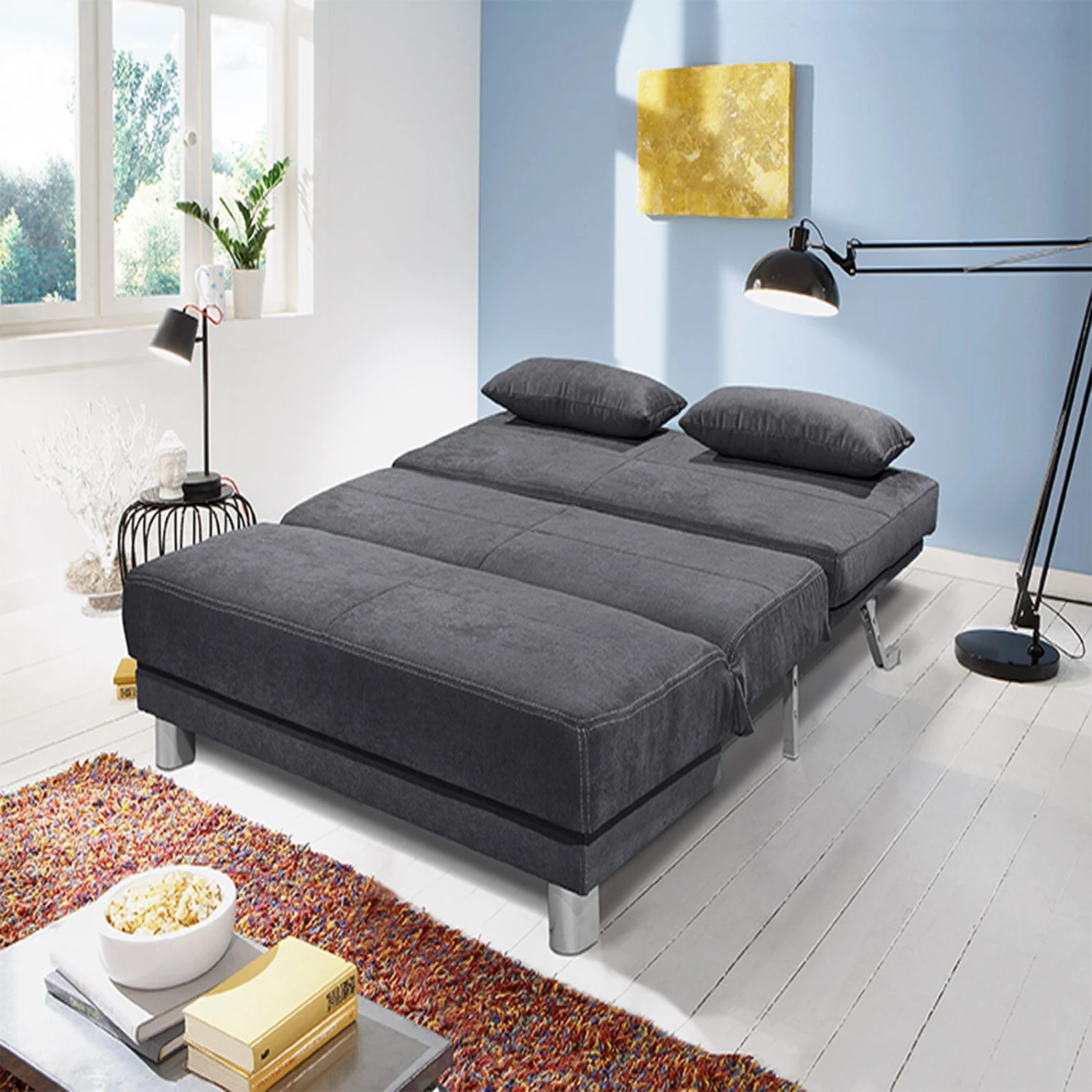 Das Faltsofa mit Ziehharmonikabeschlag lässt sich schnell in ein Schlafsofa umwandeln, um Gästen eine Schlafgelegenheit zu bieten. Durch die Faltfunktion ist es platzsparend und kann ebenso als normales Sofa verwendet werden. Ein Kissen in der gleichen Farbe ist im Lieferumfang enthalten. Dieses Multitalent ist frei stellbar und kann, dank des mit dem selben Material bezogenen Rücken, überall im Raum stehen.