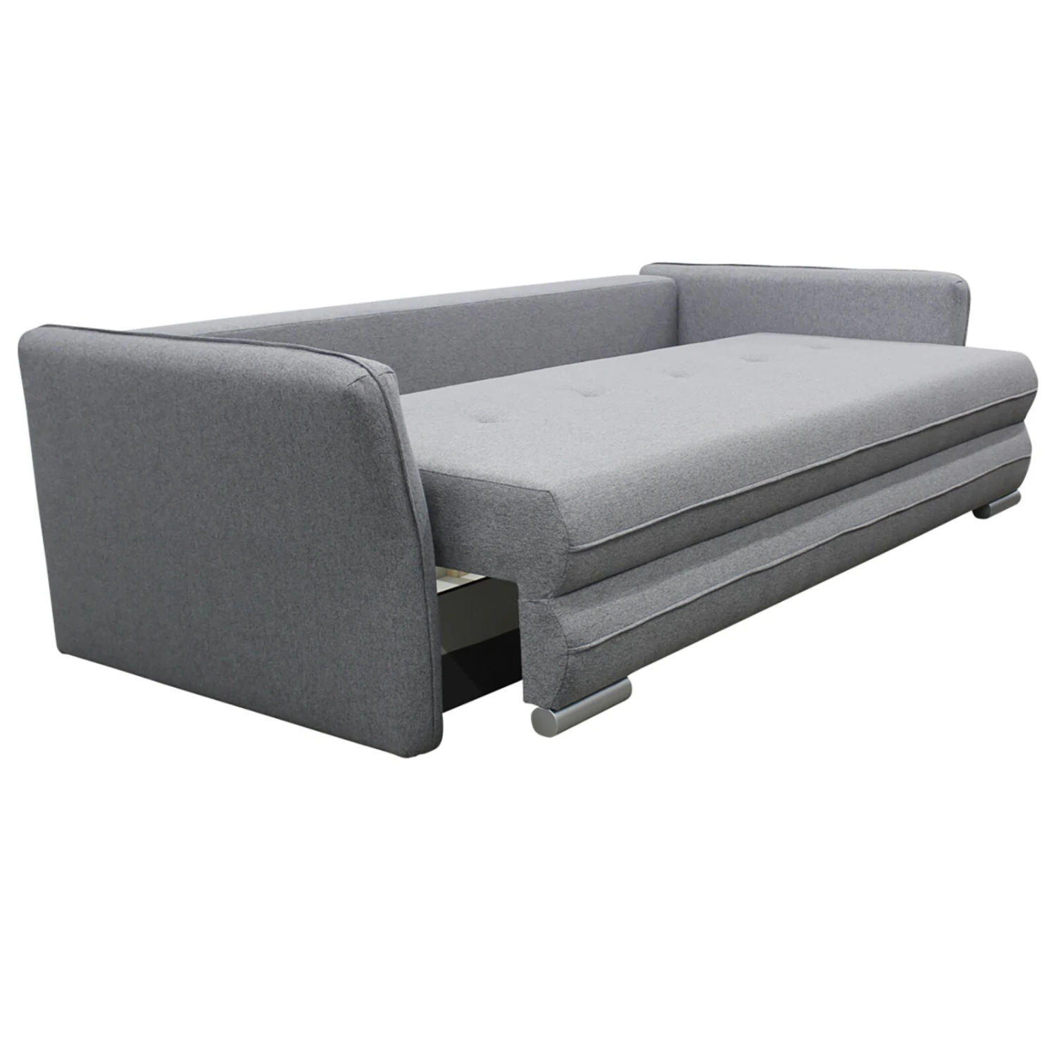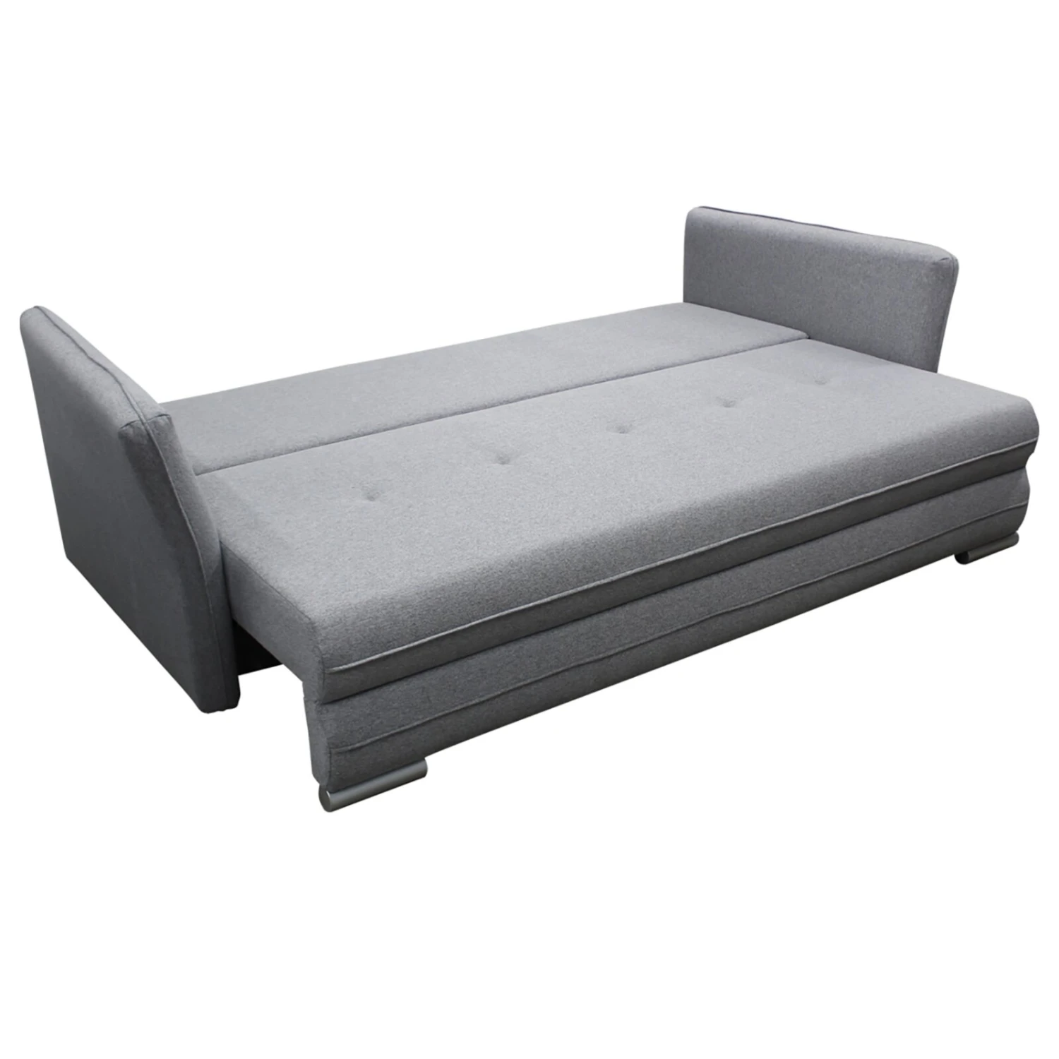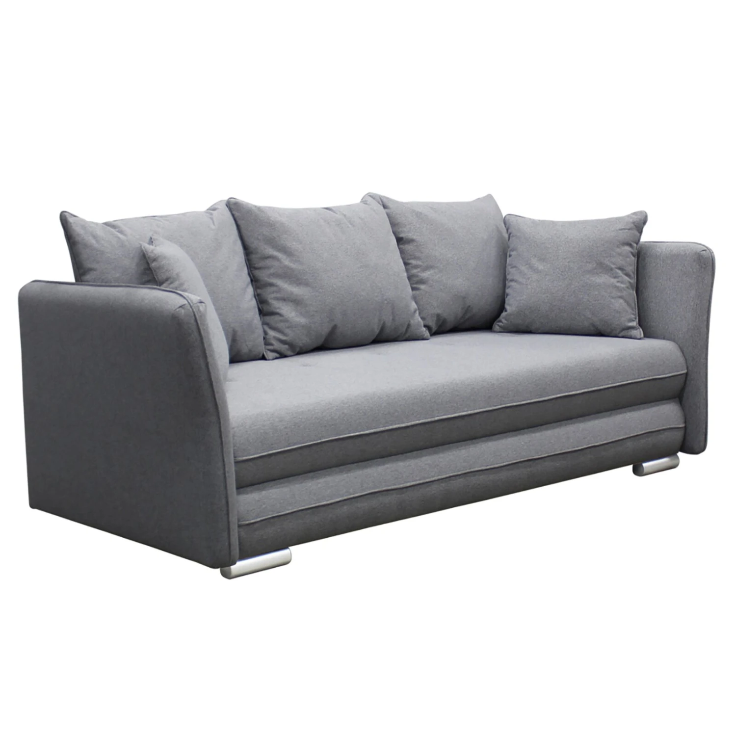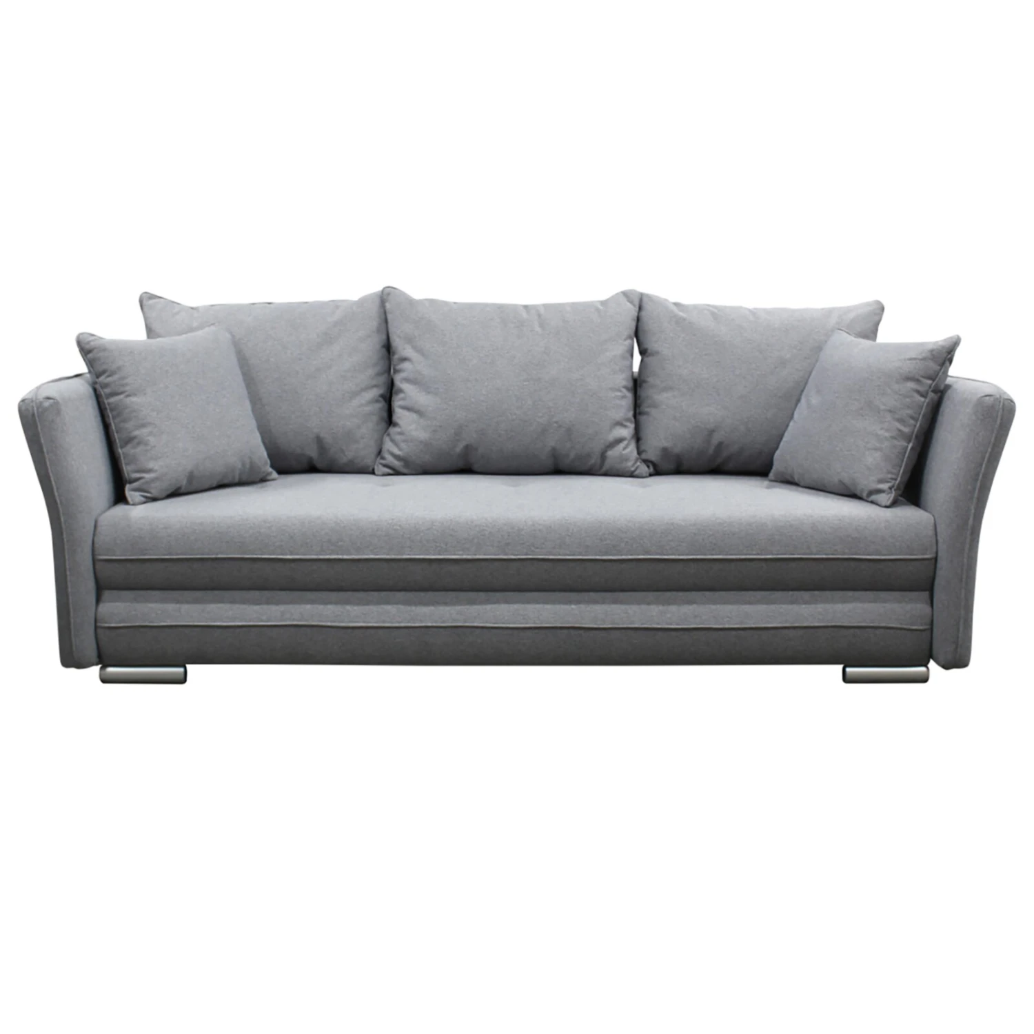Dieses graue Schlafsofa passt sich jedem Einrichtungsstil perfekt an. Durch die etwa 144 x 199 Zentimeter große Liegefläche lässt sich das Sofa kinderleicht in ein bequemes Bett für Übernachtungsgäste verwandeln. In dem Staukasten kannst du deine Tagesdecken und Kissen verstauen. Rücken- und Zierkissen sind bereits im Lieferumfang enthalten und sorgen zusätzlich für Gemütlichkeit. Abgerundet wir das schöne Design durch Kunststofffüße in Silber. Außerdem ist der Rücken im Originalstoff bezogen, so dass du das Schlafsofa auch frei im Raum platzieren kannst.
