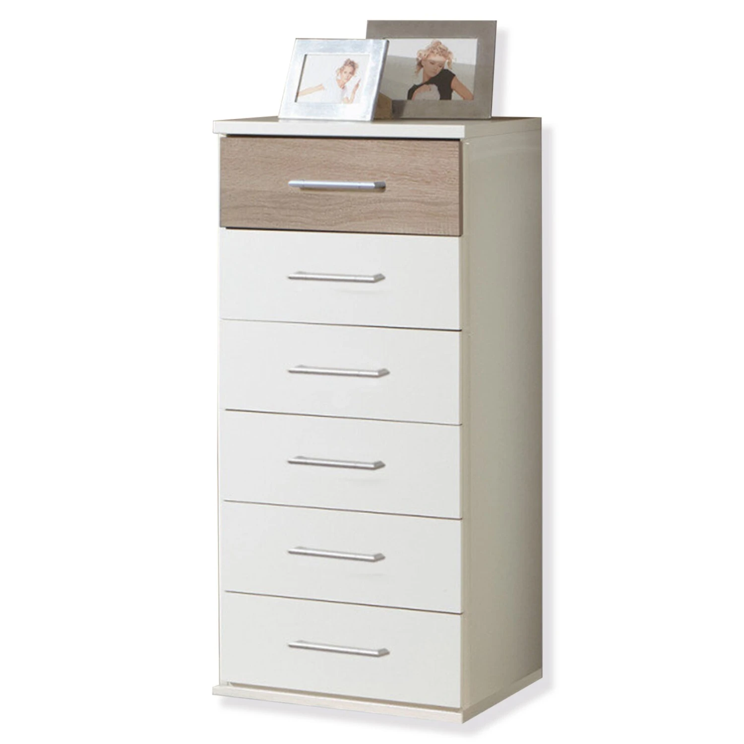 Moderne und elegante Schubkastenkommode in der topaktuellen Farbausführung Alpinweiß mit Absetzungen in Eiche sägerau-Nachbildung.