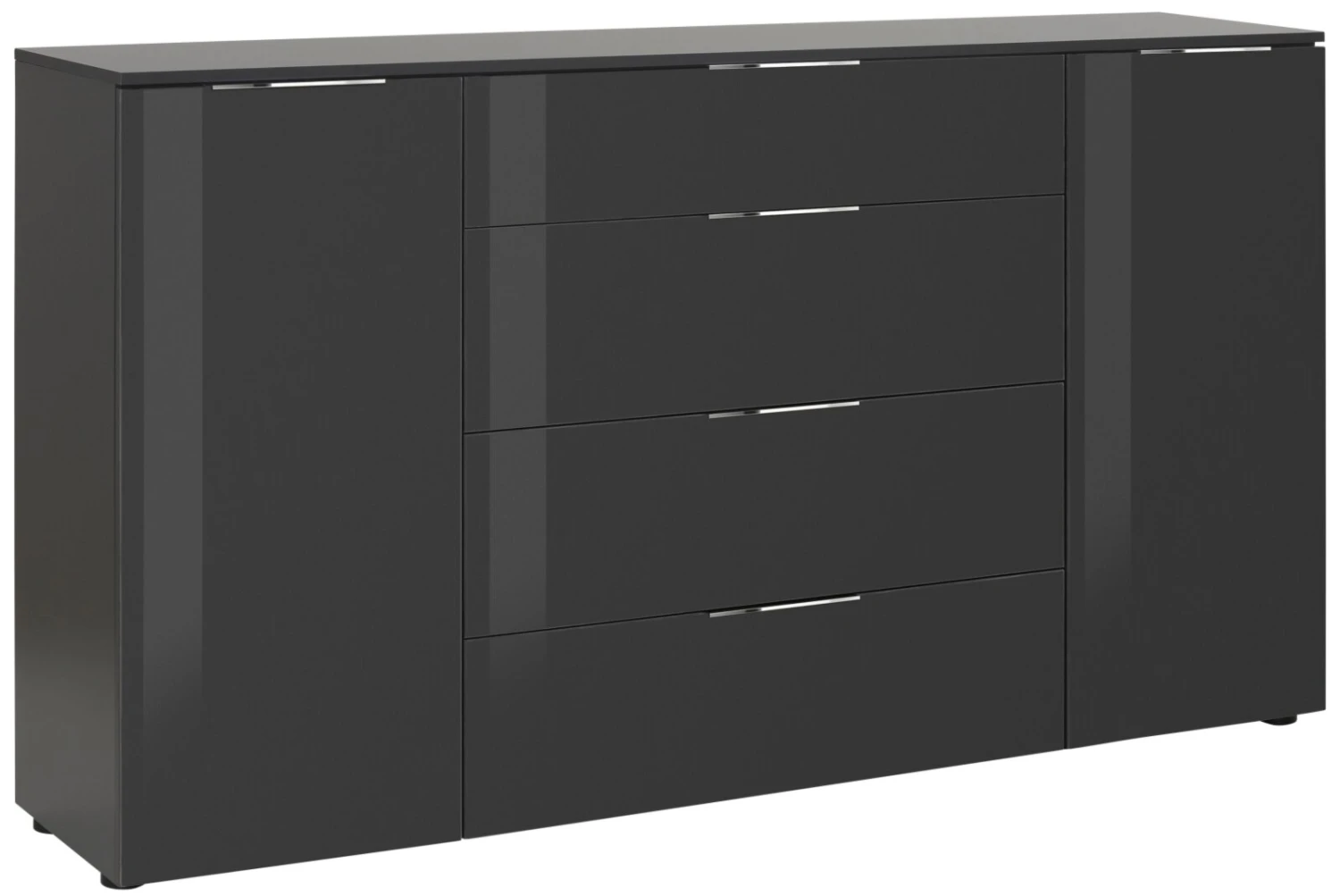 Dieses Sideboard im anthrazitfarbigen Stil mit zwei Türen und vier Schubkästen bietet ausgiebig Stauraum für viele Ihrer Gegenstände. Die Türen sowie die Schubkästen sind gedämpft und sehen mit der anthrazitfarbigen Glasfront höchst elegant aus. Der matte Korpus, die chromfarbigen Griffleisten sowie der lackierte Glasaufsatz untermalen das moderne Design.