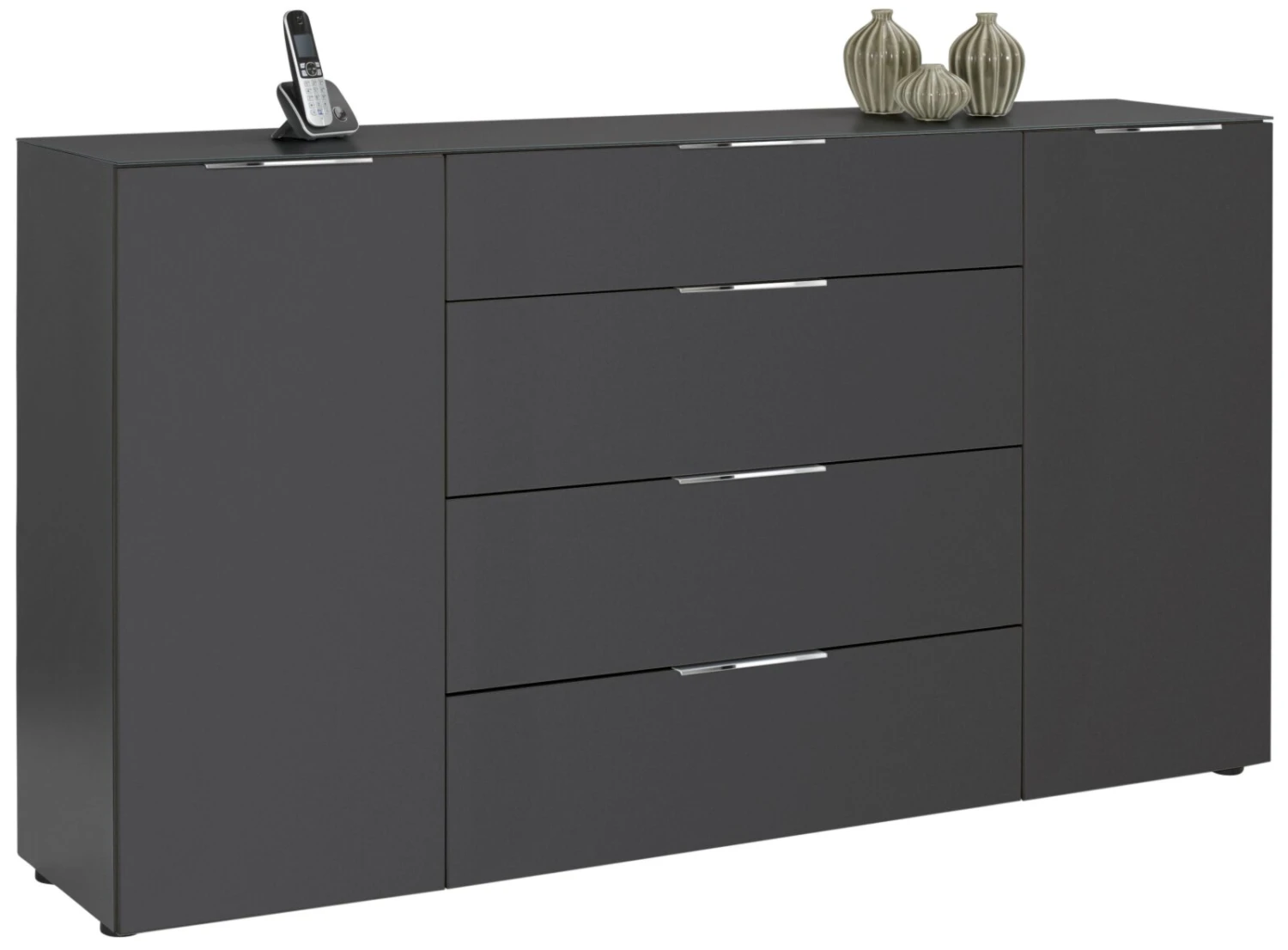 Mit zwei Türen und insgesamt vier Schubkästen sorgt dieses weiß-matte Sideboard für reichlich Stauraummöglichkeiten. Hier können Sie einige Ihrer Gebrauchsgegenstände unterbringen. Hinter den beiden Türen, die mit einer praktischen Dämpfung ausgestattet sind, befinden sich je zwei Einlegeböden, die den Innenraum perfekt aufteilen. In den vier Schubkästen, die ebenfalls gedämpft sind, können Sie kleinere Utensilien verstauen. Der weiß lackierte Glasaufsatz verleiht dem Sideboard eine stilvolle Optik, die von den chromfarbenen Griffleisten stimmig abgerundet wird.