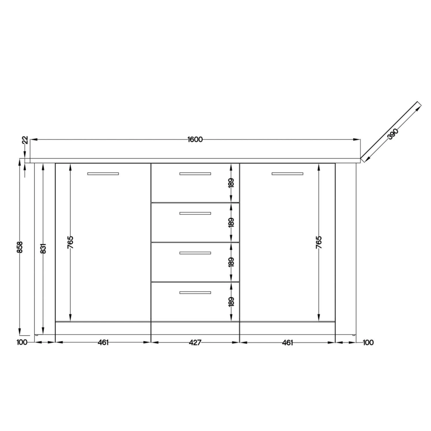 Dieses Sideboard in Artisan Eiche Nachbildung ist mit zwei Türen und vier Schubkästen ausgestattet. Die Schubkästen können jeweils mit etwa 5 kg belastet werden. Hinter den beiden Türen befindet sich jeweils ein Einlegeboden, welcher mit jeweils ca. 20 Kilogramm belastet werden kann. Sie haben hier also die Möglichkeit jede Menge Dinge zu verstauen und mit Leichtigkeit Ordnung zu halten.