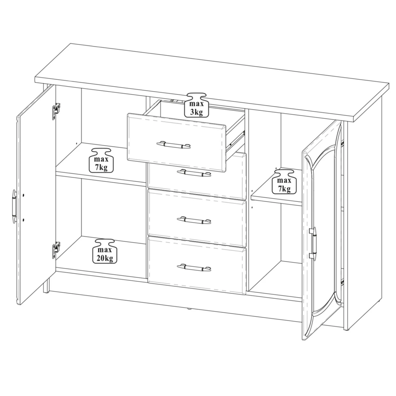 In zeitloser Buche Nachbildung präsentiert sich diese etwa 125 Zentimeter breite Kommode, die für reichlich Stauraummöglichkeiten sorgen wird. Diese finden Sie in vier Schubkästen und hinter zwei Türen, deren Innenräume von je einem Einlegeböden praktisch aufgeteilt werden.