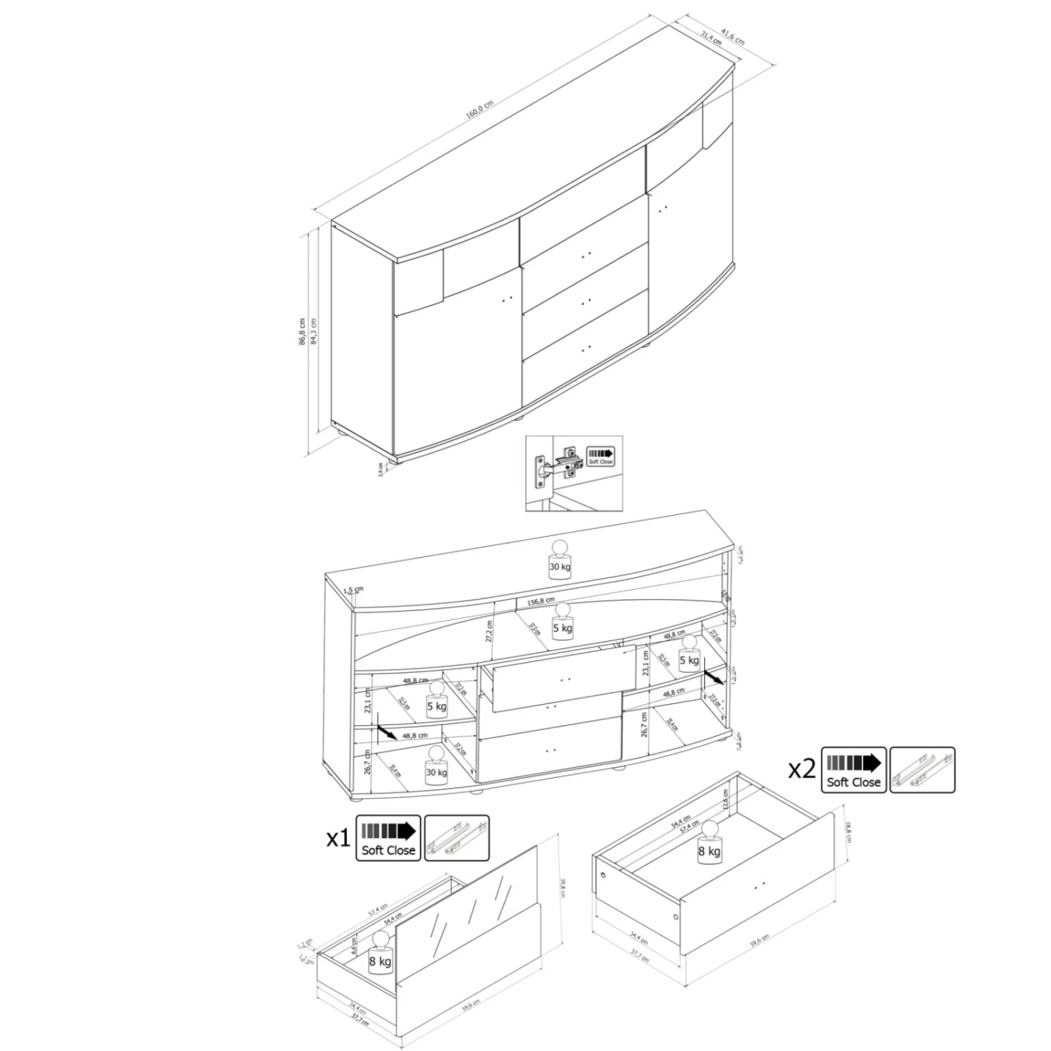 Das Sideboard aus der Serie GATE präsentiert sich in einem attraktiven und eleganten Design. Das perfekte Produkt für alle, die viel Stauraum zu schätzen wissen und ein modernes Design lieben. Schubladen und Türen sind mit einem Selbsteinzug ausgestattet, wodurch die Lebenserwartung der Türen und der Schubladen erhöht wird.