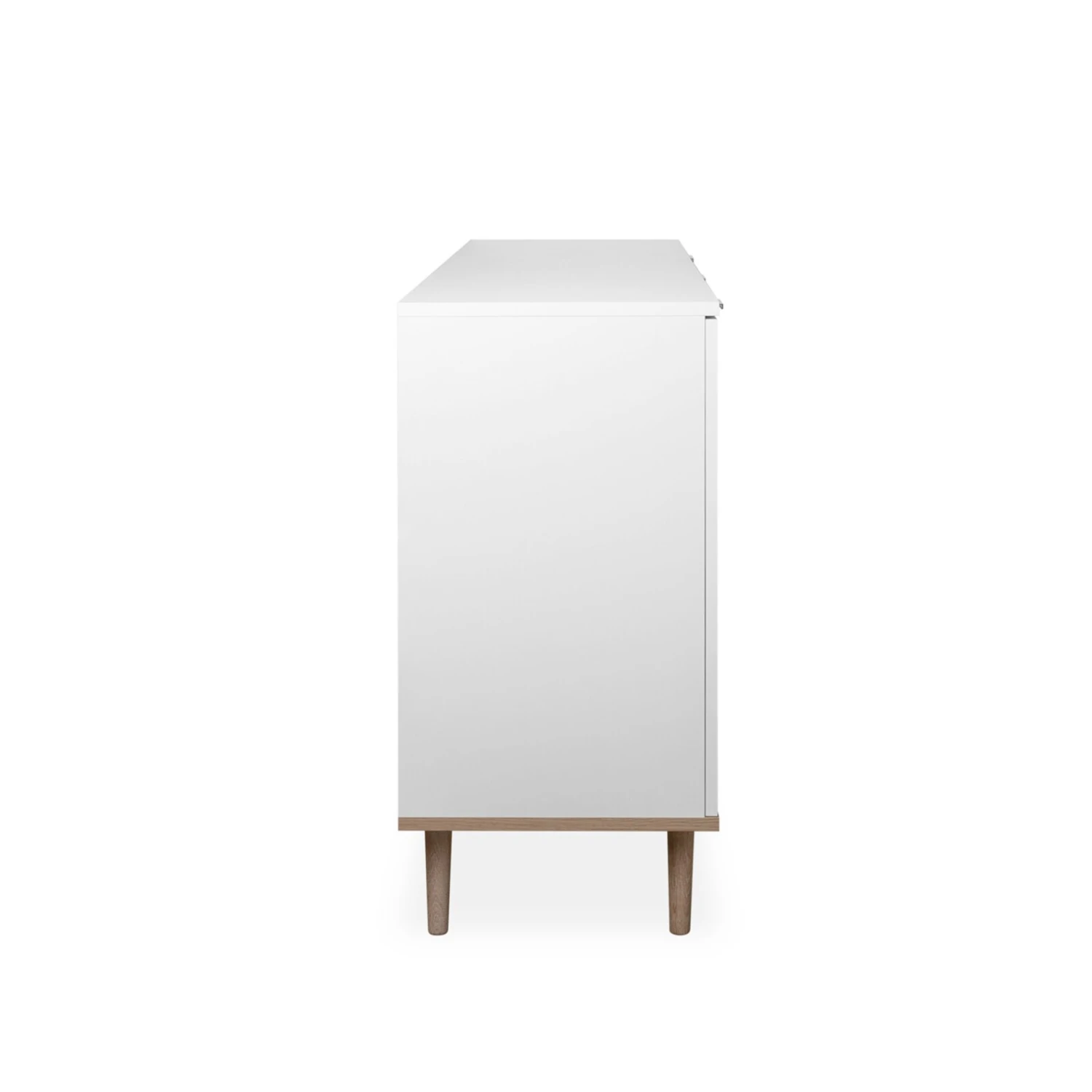 Im skandinavischen Design ist die weiße Kommode mit ihrem Absatz aus Sonoma Eichen Nachbildung ein elegantes Einrichtungsaccessoire nicht nur für das Schlafzimmer, sondern auch zum Beispiel für das Wohnzimmer oder den Eingangsbereich. Unterstrichen wird der Skandi-Look von der matt-weißen Oberfläche zusammen mit den stabilen, konischen Massivholz-Füßen. Die Kombination aus einem Schubkasten sowie den großen Fächern, die sich hinter drei Türen verbergen, bieten Ihnen zahlreiche Möglichkeiten kleinere Dinge, aber auch größere Gegenstände wie zum Beispiel Vasen unterzubringen.