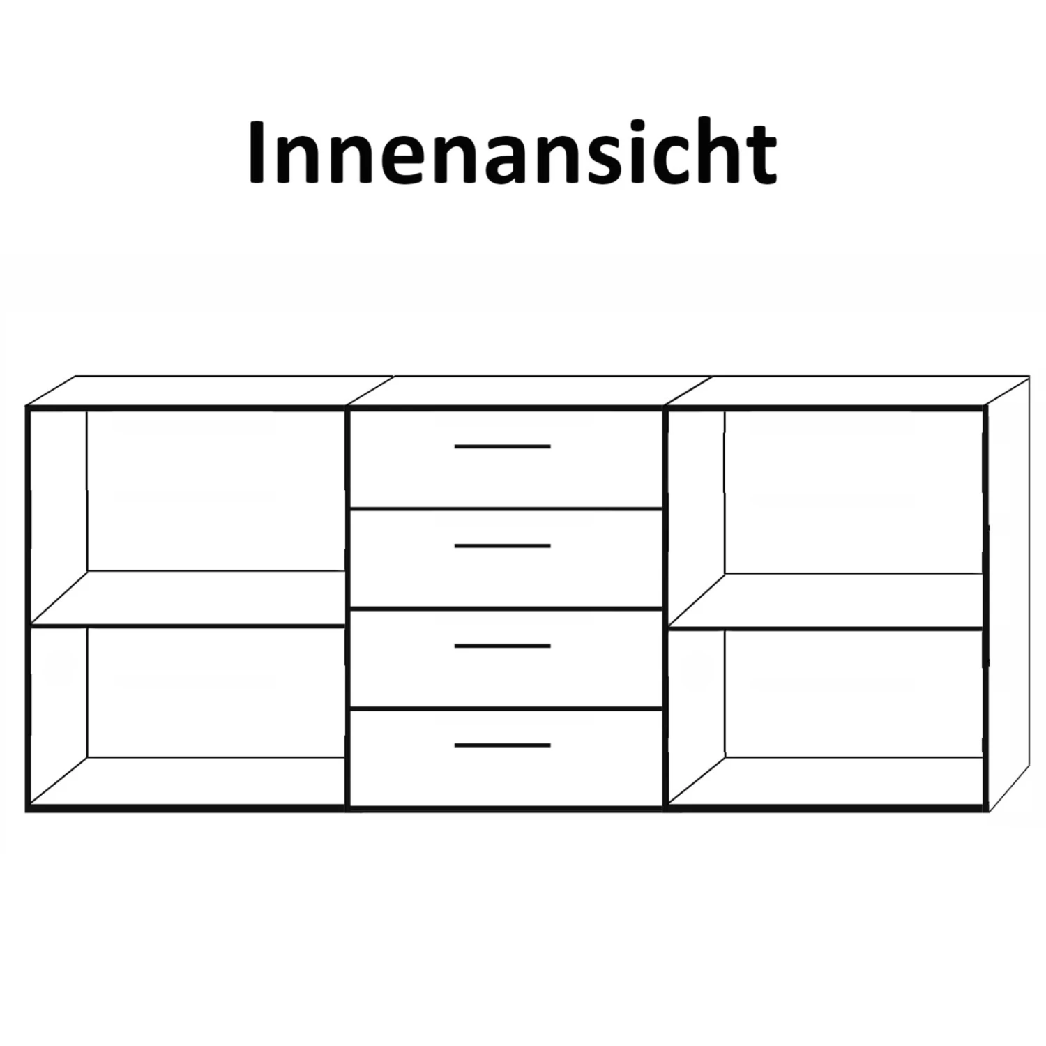 Robustes Sideboard aus Kernbuche Massivholz mit 2 Türen und 4 Schubladen. Diese Kommode ist mit Metallgriffen ausgestattet und besteht aus 4 Fächern hinter den Türen außen und 4 Schbubkästen mittig.