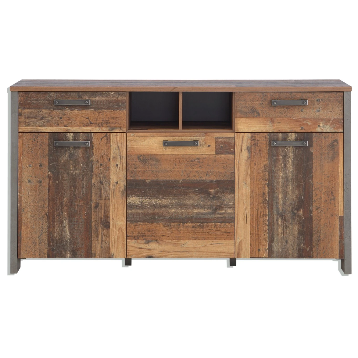 Der rustikale Look von diesem Sideboard wird in Ihren Räumlichkeiten ein warmes und wohnliches Ambiente versprühen! Die Kombination aus Holz- und Beton-Optik verleiht diesem Möbelstück ein raffiniertes Äußeres. Hinter drei Türen, in zwei Schubkästen und in zwei offenen Fächern bietet dieses Sideboard reichlich Platz zum Verstauen verschiedenster Untensilien.