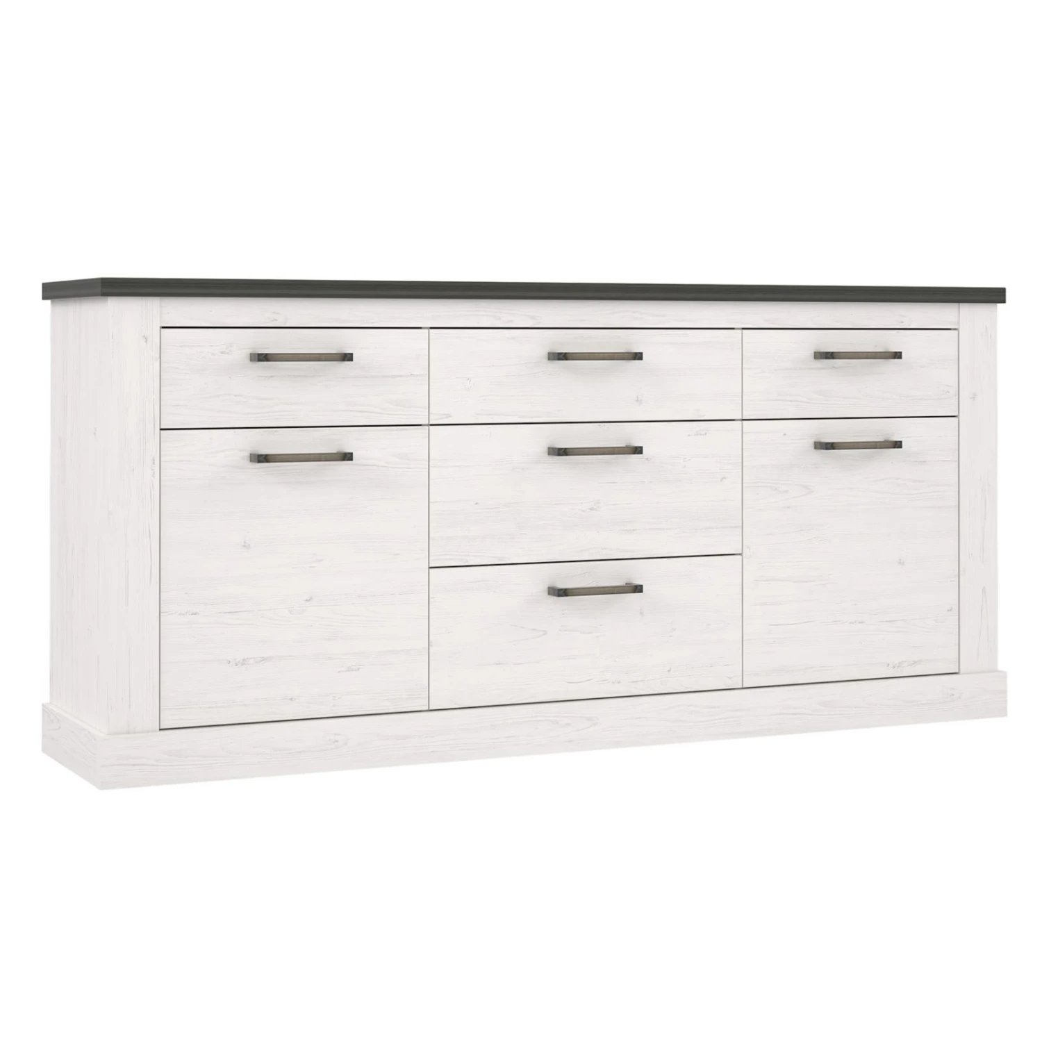 Das Stauraumwunder für Ihren Wohnbereich oder für Ihr Esszimmer in einem hellen Pinie-Weiß mit Absetzungen in Touchwood Nachbildung. Das Sideboard verfügt insgesamt über fünf Schubkästen, die Platz für viele Kleinigkeiten, wie Servietten, Kabel, Kerzen und ähnliches bieten. So sind diese einfach zu verstauen und doch immer schnell griffbereit. Für größere Gegenstände bieten sich die Fächer hinter den beiden Drehtüren an. Diese können durch jeweils einen Einlegeboden in praktische Fächer untereilt werden.