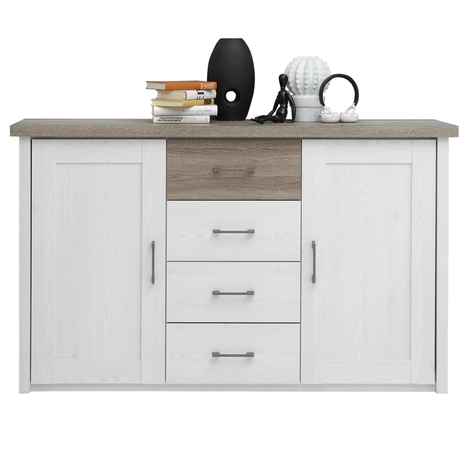 Das hübsche Sideboard aus dem tollen Schlafzimmerprogramm sieht einfach fabelhaft aus und überzeugt zudem mit viel Stauraum. Es verfügt über zwei Türen, zwei Einlegeböden und vier Schubkästen. Das Design in Pinie Weiß und Trüffel Dekor bringt Gemütlichkeit in Ihr Schlafzimmer.