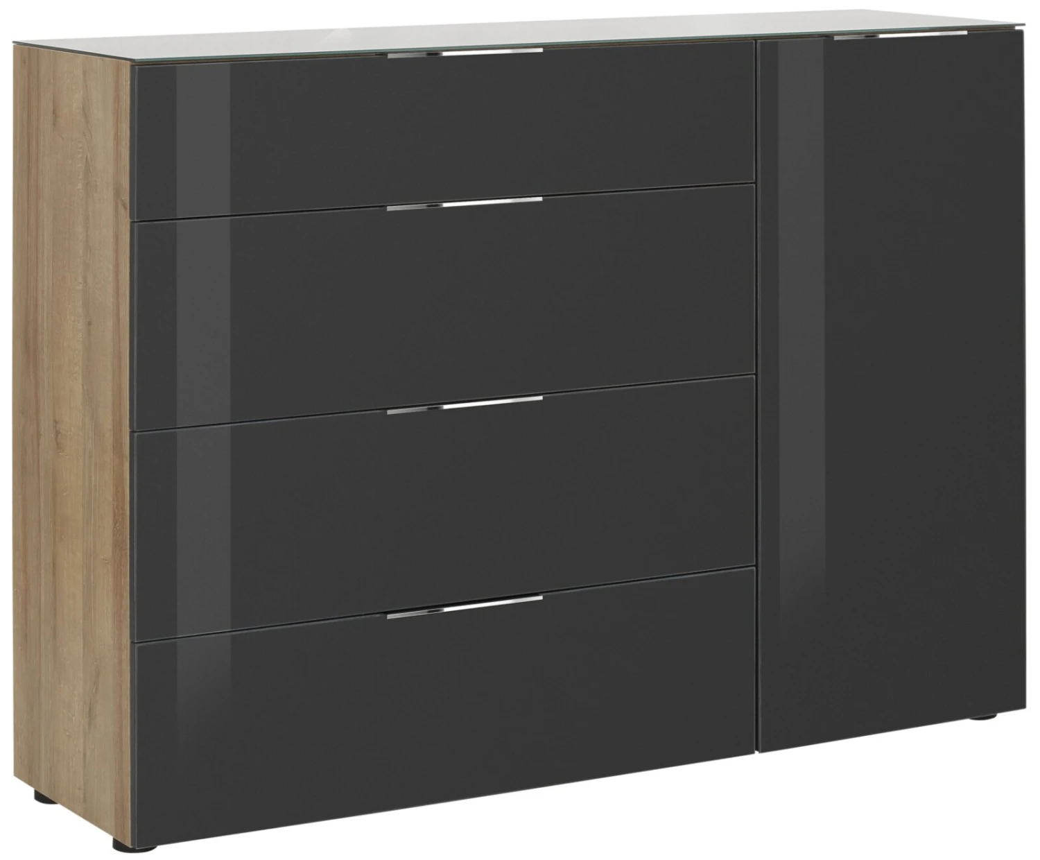 Das Sideboard präsentiert sich in einem Farbmix aus Riviera Eiche Nachbildung und Anthrazit und bietet einiges an Stauraummöglichkeiten. Den eleganten Look erlangt das Stauraumwunder durch den anthrazit lackierten ESG-Sicherheitsglas-Aufsatz, sowie durch die Griffleisten aus chromfarbenem Metall. Die Tür und Schubkästen sind mit Dämpfungen ausgestattet, sodass diese sanft und leise geschlossen werden. Hinter der Tür befinden sich zwei Einlegeböden, die Sie in der Höhe verstellen können.