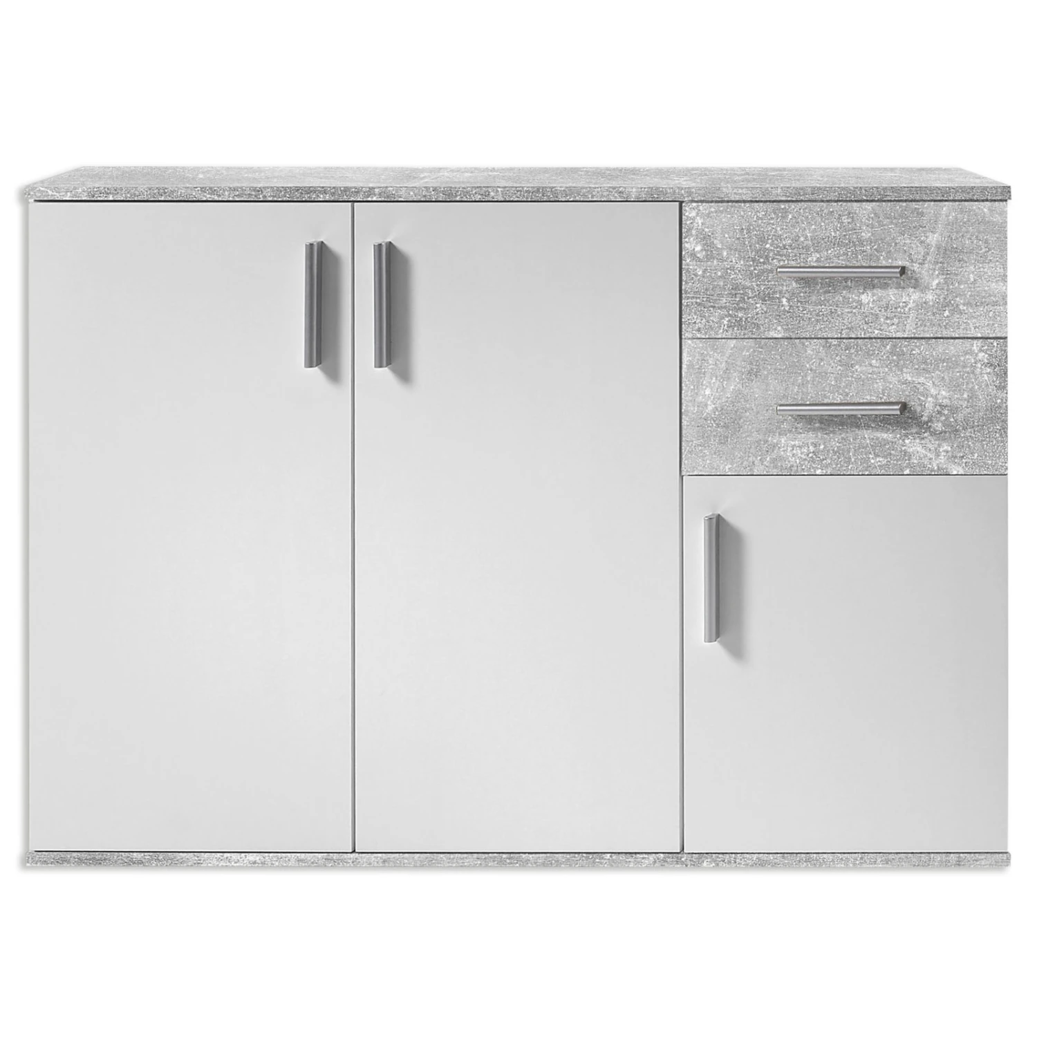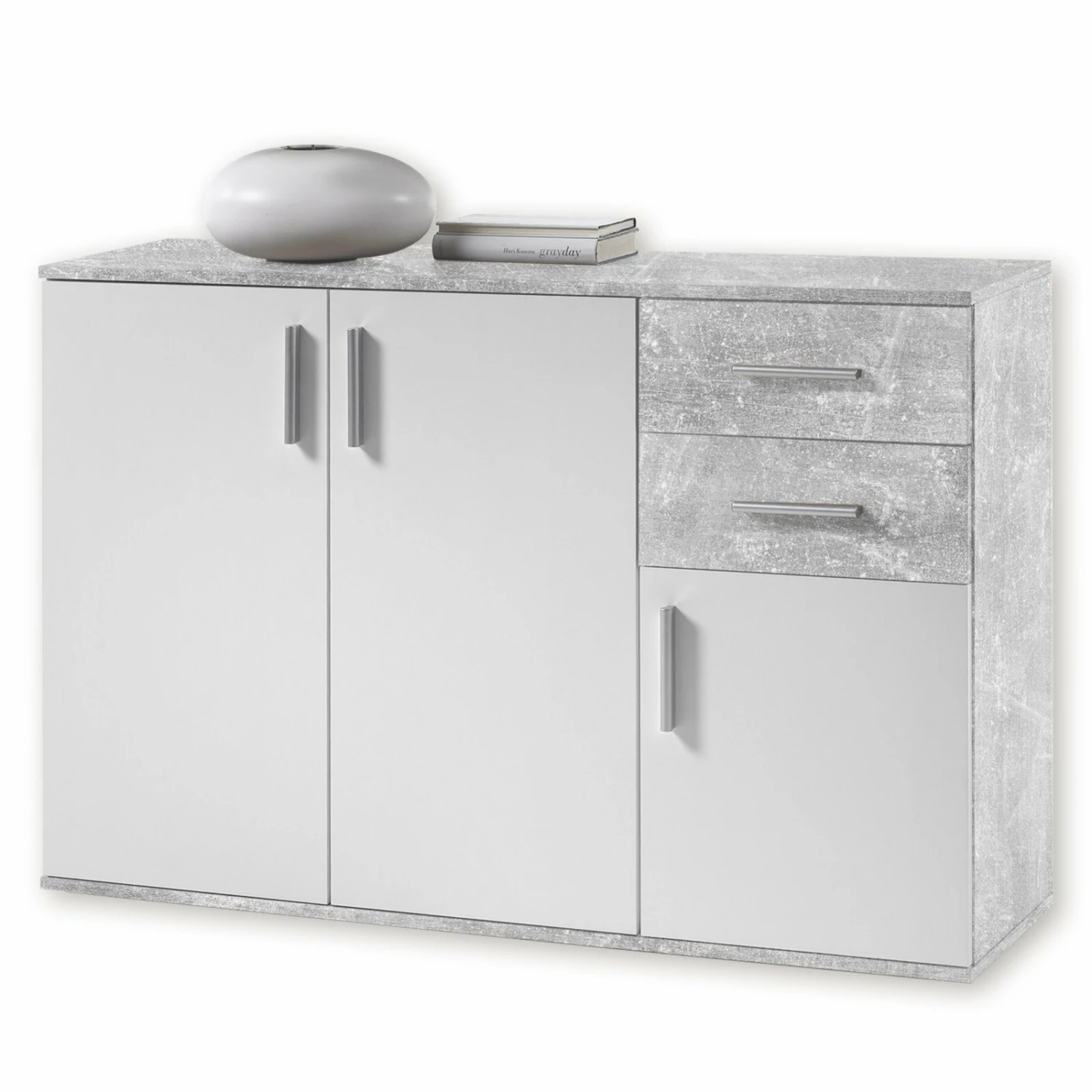 Helles, modernes Sideboard in Weiß und Betonoptik. Es ist mit drei Türen und zwei Schubkästen ausgestattet. Hinter den links angebrachten Türen befinden sich, getrennt durch einen Einlegeboden, zwei großzügige Fächer.