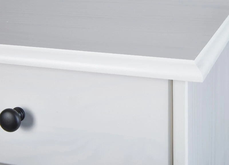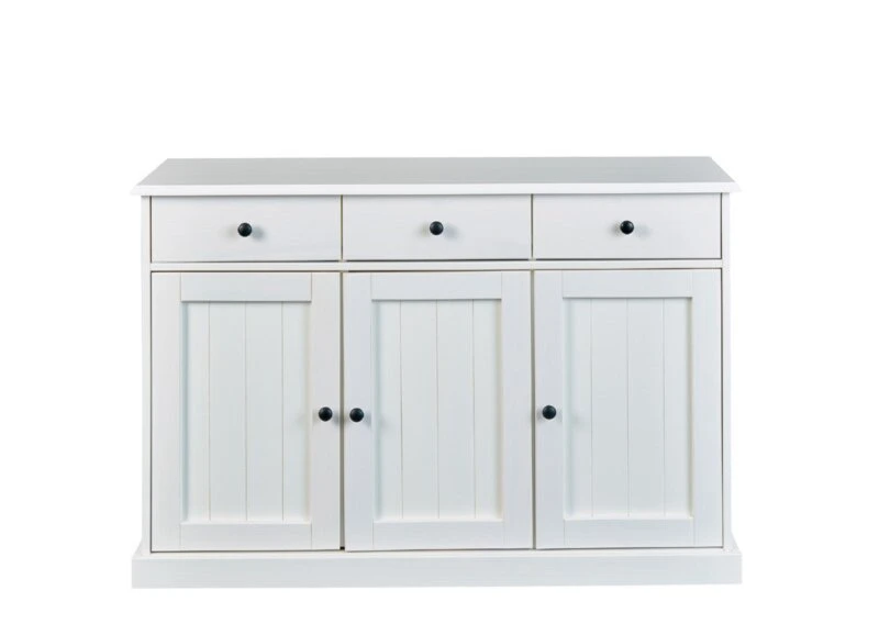 Zusätzlichen Stauraum erhalten Sie mit dem Sideboard WESTERLAND. Hinter drei Drehtüren und in drei Schubkästen finden Sie viel Platz für Geschirr, Schüsseln oder auch DVDs und Zeitschriften. Die Oberseite können Sie passend dekorieren. Egal, ob mit Blumen, Kerzen, persönlichen Fotos oder als zusätzliche Ablagefläche für Gläser, Ihren Vorstellungen sind keine Grenzen gesetzt. Das komplette Sideboard ist aus Massivholz mit schwarzen Griffen aus Holz. Durch den weißen Lack schimmert die Holzmaserung durch und unterstützt eine wohnliche Atmosphäre.