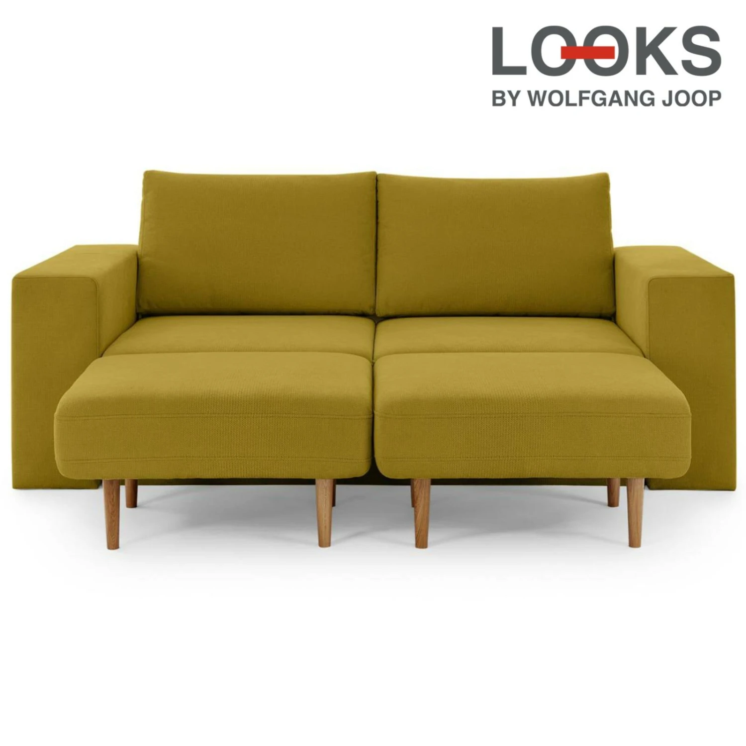 Sofa mit 2 Hockern – LOOKS by Wolfgang Joop – senf – Armlehne mit Regal – 212 cm