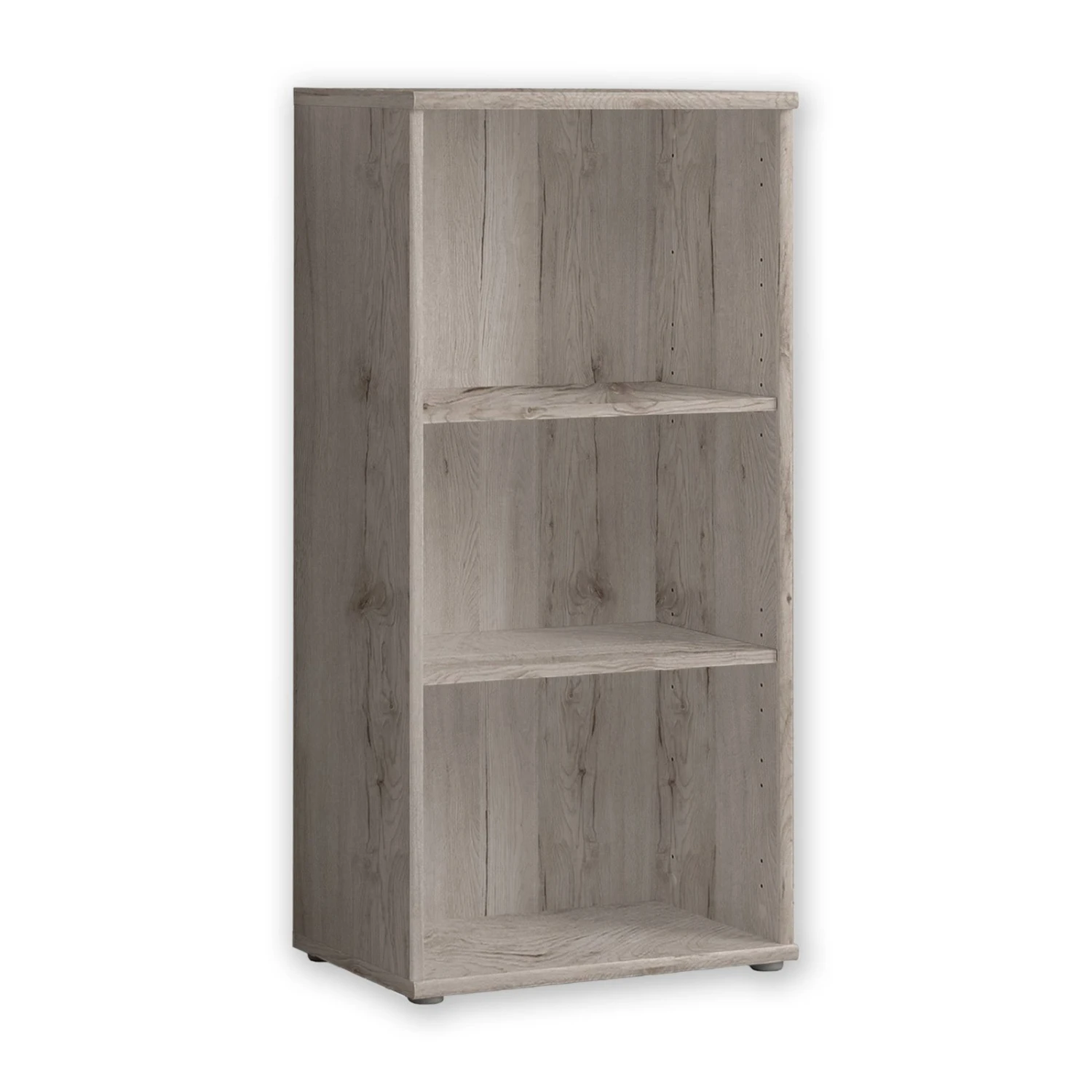 Ein schickes und funktionelles Standregal. In Sandeiche Nachildung lässt es sich mit vielen Einrichtungsstilen kombinieren. Die beiden Einlegeböden können jeweils mit etwa 5 kg belastet werden und auch in der Höhe variiert werden.