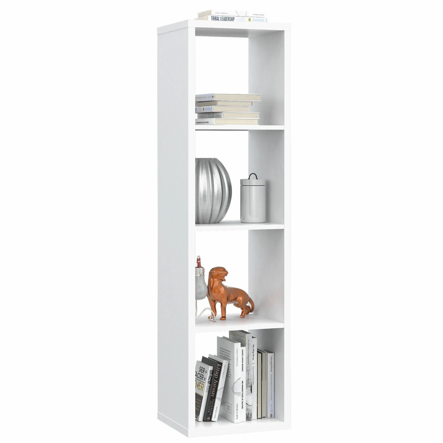 Vier offene Fächer, in denen zum Beispiel Bücher oder Dekorationsartikel untergebracht werden können, bietet dieses weiße Standregal. Da das Regal keine Rückwand hat, ist es von beiden Seiten zugänglich. Das Regal kann perfekt in Nischen untergebracht werden, da es sehr schmal ist.