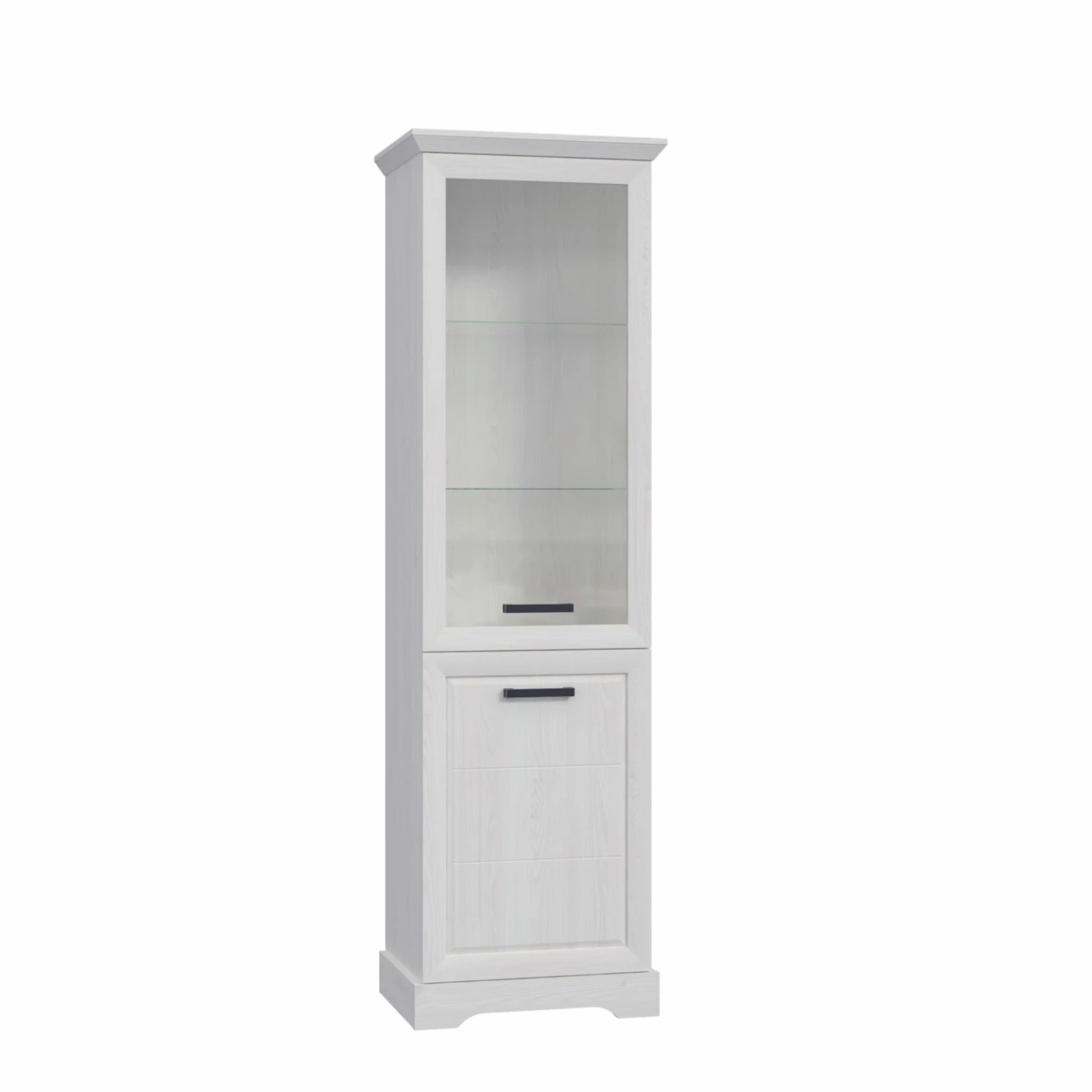 Diese schöne Standvitrine ist mit ihrer Sibiu Lärche Nachbildung im Landhausstil gehalten. Sie ist oben mit einer Glastür und unten mit einer Holztür ausgestattet. Hinter der Glastür finden Sie durch die zwei Glaseinlegeböden drei Fächer, um Ihre Deko und Lieblingsstücke in Szene zu setzen. Das Metall der Griffe ist in Schwarz gehalten und rundet das Design zusätzlich ab.