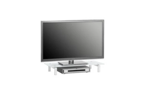 Modernes TV-Board mit weißem Gestell und einer Weißglasplatte die für TV-Geräte mit einem maximalen Gewicht von ca. 45 kg ausgelegt ist. Das schlichte Design des Boards lässt sich in viele Wohnstile integrieren und der Aufbau ist innerhalb von wenigen Sekunden abgeschlossen.