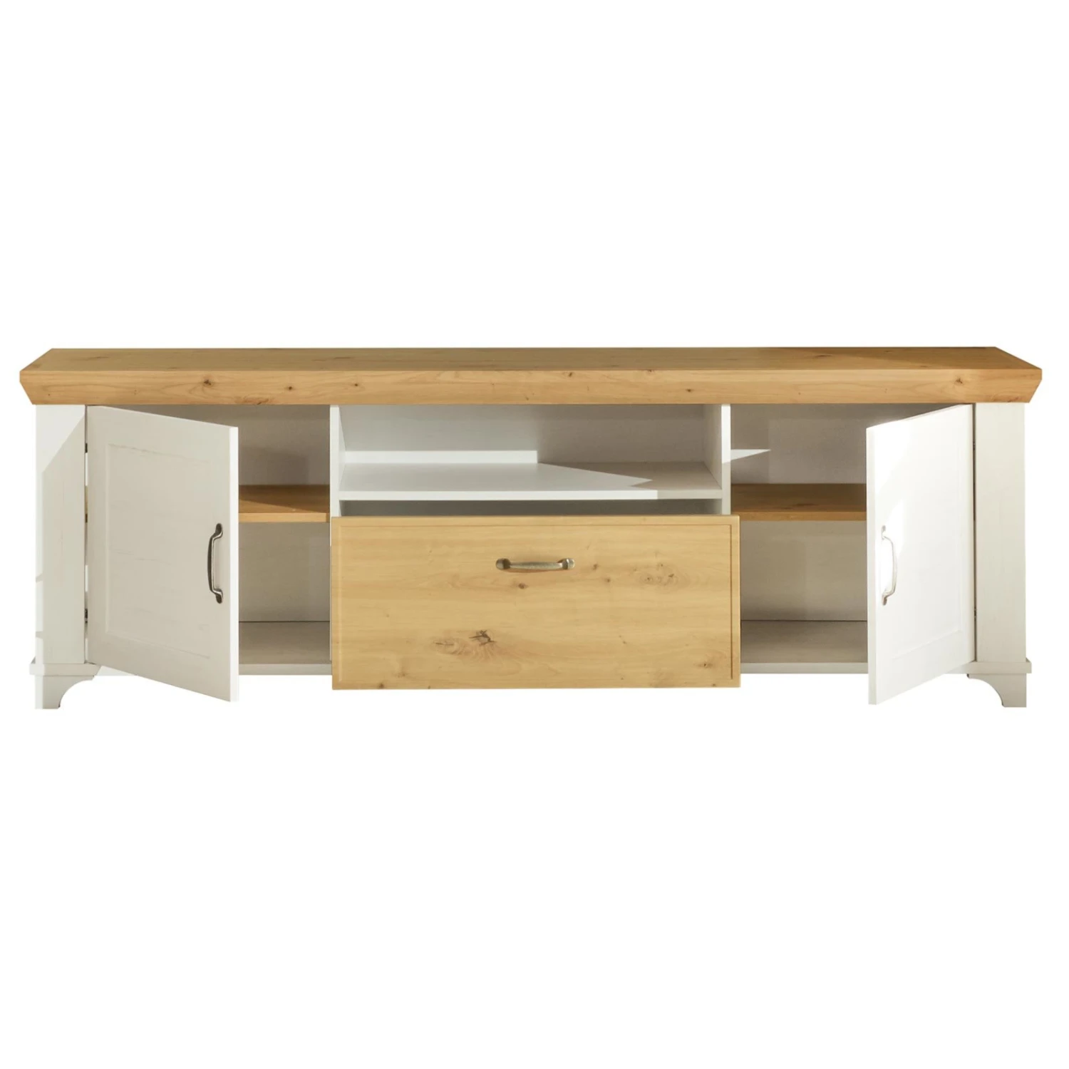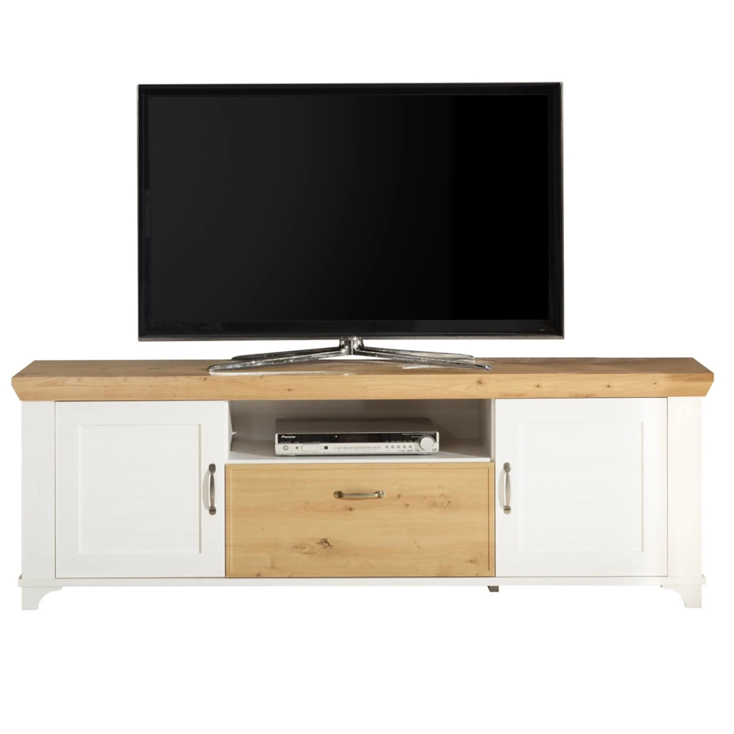 Dieses TV-Lowboard hat eine Breite von etwa 179 Zentimetern und wäre der ideale Platz für Ihr TV-Gerät und das dazugehörige Zubehör. Hinter zwei Türen und in einem Schubkasten bietet es Stauraum für weitere Gerbauchsgegenstände. Für Ihren DVD-, BlueRay-Player und Co. steht Ihnen ein offenes Gerätefach zur Verfügung. Die Kombination aus Anderson Pine und Artisan Eiche Nachbildung verleiht diesem TV-Lowboard das gewisse Etwas!