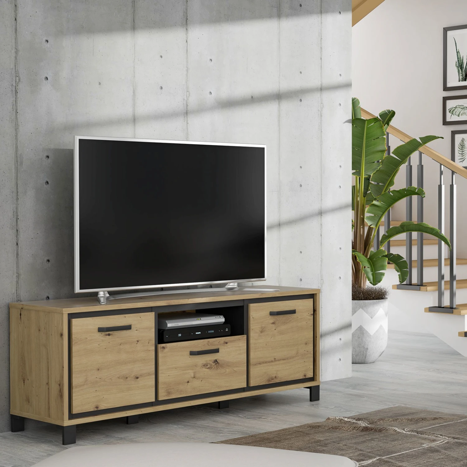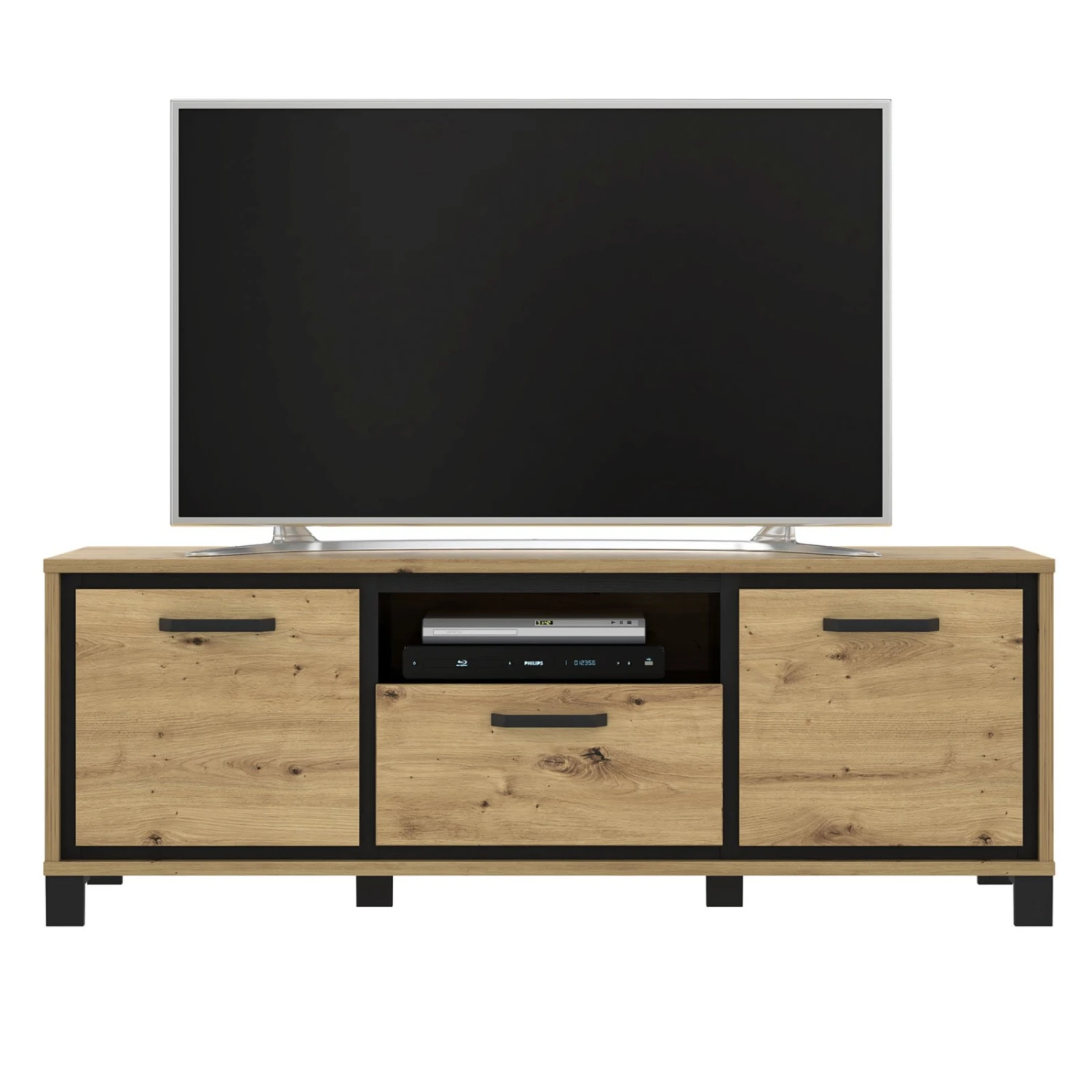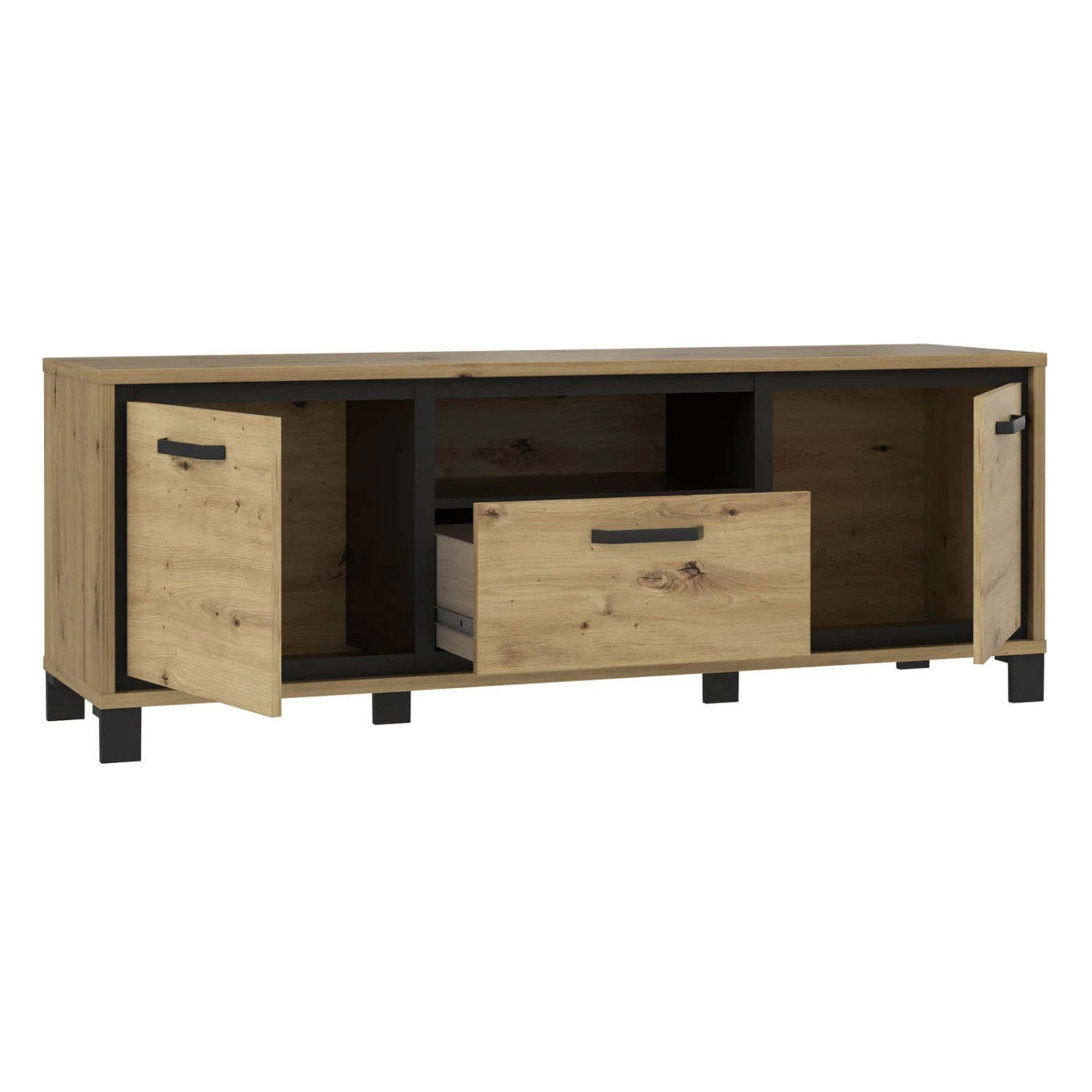 Durch den Mix aus Artisan Eiche, Schwarzeiche und Metall erlangt das etwa 158 Zentimeter breite TV-Lowboard den modernen Industrial-Look. Die Modernität wird sich in Ihrem Wohnraum widerspiegeln und für ein tolles Raumambiente sorgen. Zudem finden Sie hinter zwei Türen, in einem Schubkasten und im offenen Fach viel Platz für all Ihr TV-Zubehör.