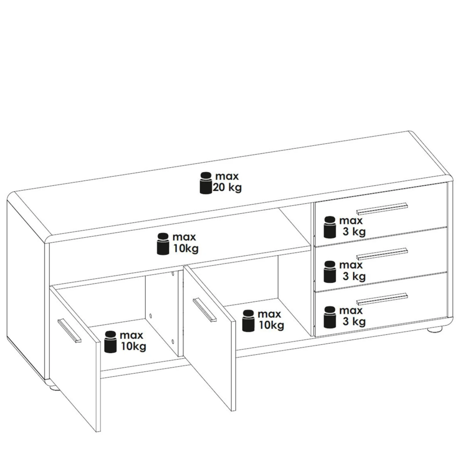 Dieses moderne TV-Lowboard mit einem Korpus in Betonoptik und weißen Fronten ist ein echter Hingucker! Es bietet ausreichend Platz, um deinen großen Fernseher aufzustellen. TV-Receiver oder Spielekonsolen können in dem offenen Fach untergebracht werden. Außerdem ist das Lowboard mit drei Schubkästen und zwei Türen ausgestattet.