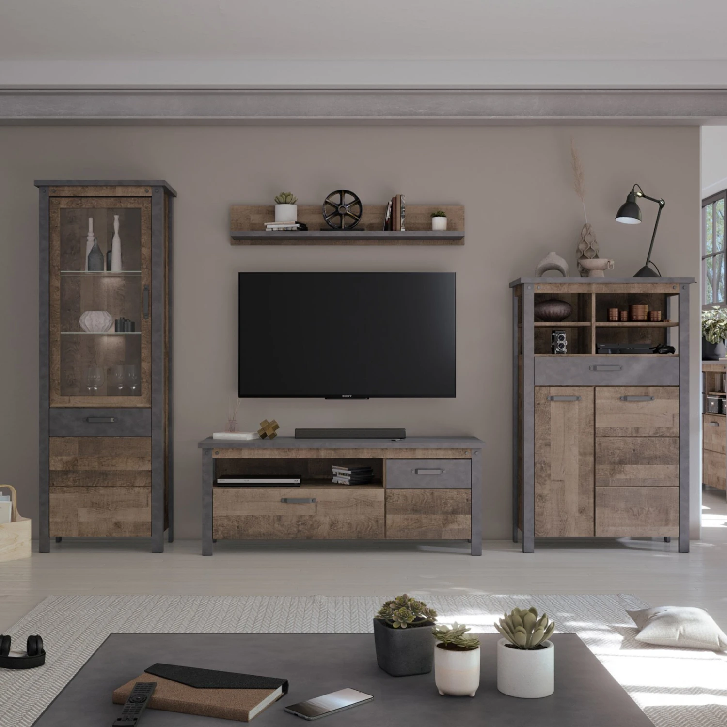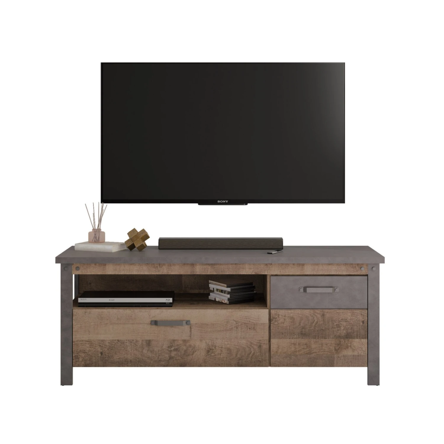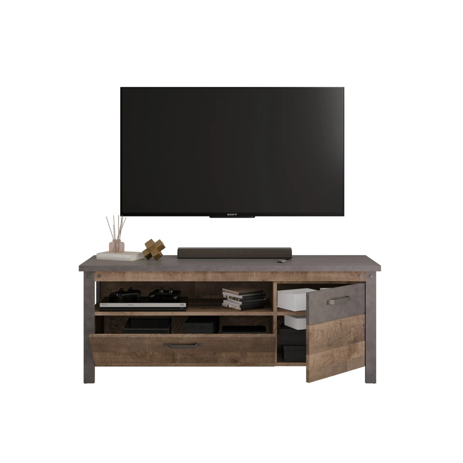 Mit diesem TV-Lowboard OLIVER vervollständigen Sie ihr Wohnzimmer im Industrial-Style. Ihre Spielekonsolen oder TV-Receiver finden in dem offenen Fach ihre Plätze. Hinter einer Tür und einer Klappe bietet es Stauraum für weitere Gerbauchsgegenstände. Die Kombination aus Tabak Eiche und Matera Nachbildung verleiht diesem TV-Lowboard das gewisse Etwas!