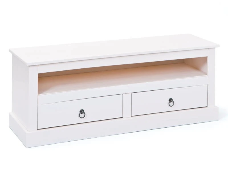 Modernes TV-Lowboard im Landhausstil. Mit den zwei Schubladen und dem großzügigen offenen Fach bietet sich genügend Platz zum Verstauen Ihrer Receiver, DVD-Player, Spielekonsolen oder Utensilien. Die Griffe aus Metall erzeugen ein stimmiges Gesamtbild.