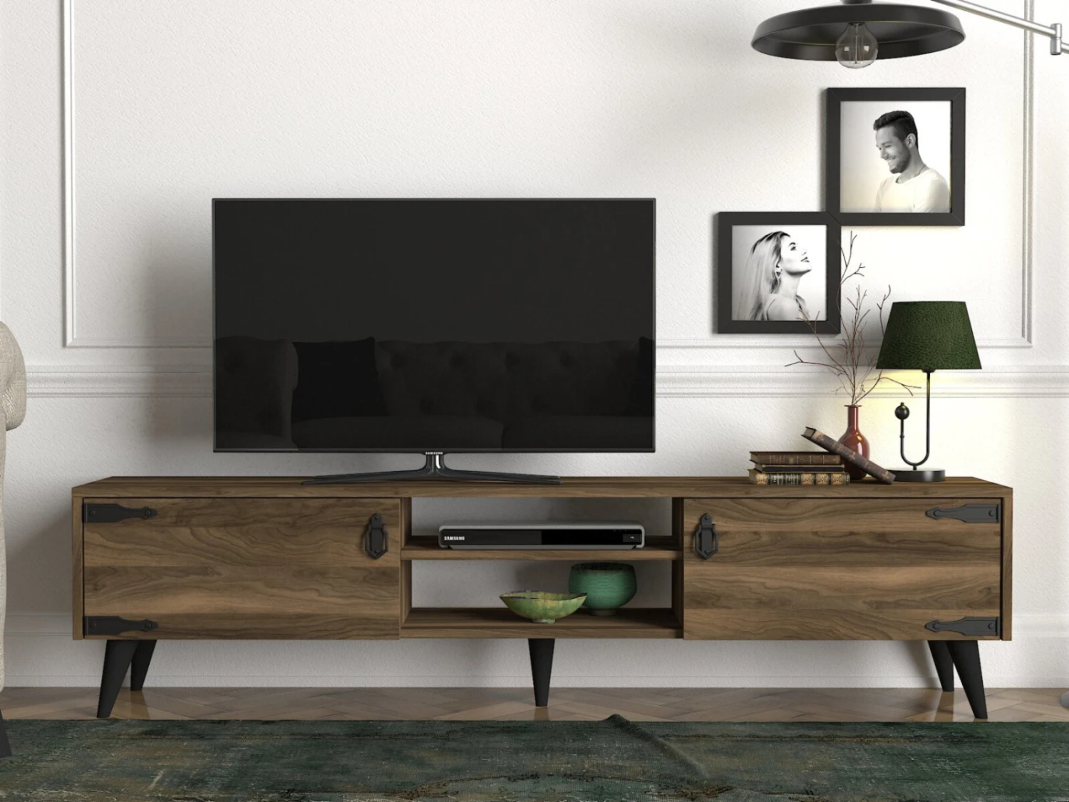Für einen stilvollen Einrichtungsakzent sorgt dieses TV-Lowboard in walnussbrauner Holzoptik. Hergestellt ist das Wohnzimmermöbel aus pflegeleichten, melaminbeschichteten Holzwerkstoff. Optisch begeistert das Sideboard mit Beschlägen und Griffen aus Metall, den leicht ausgestellten Füßen und dem modernen Vintage-Look. Sie können das TV-Board mit unterschiedlichen Wohnstilen kombinieren und wahlweise zu klassischen, rustikalen oder auch modernen Möbeln stellen. Hinter den beiden Türen und in den offenen Fächer stehen Ihnen viele Stauraummöglichkeiten zur Verfügung. Verwahren Sie hier Bücher, Spiele oder Wohnaccessoires. Auf der Oberplatte findet Ihr TV-Gerät als auch weitere Dekoration seinen Platz.