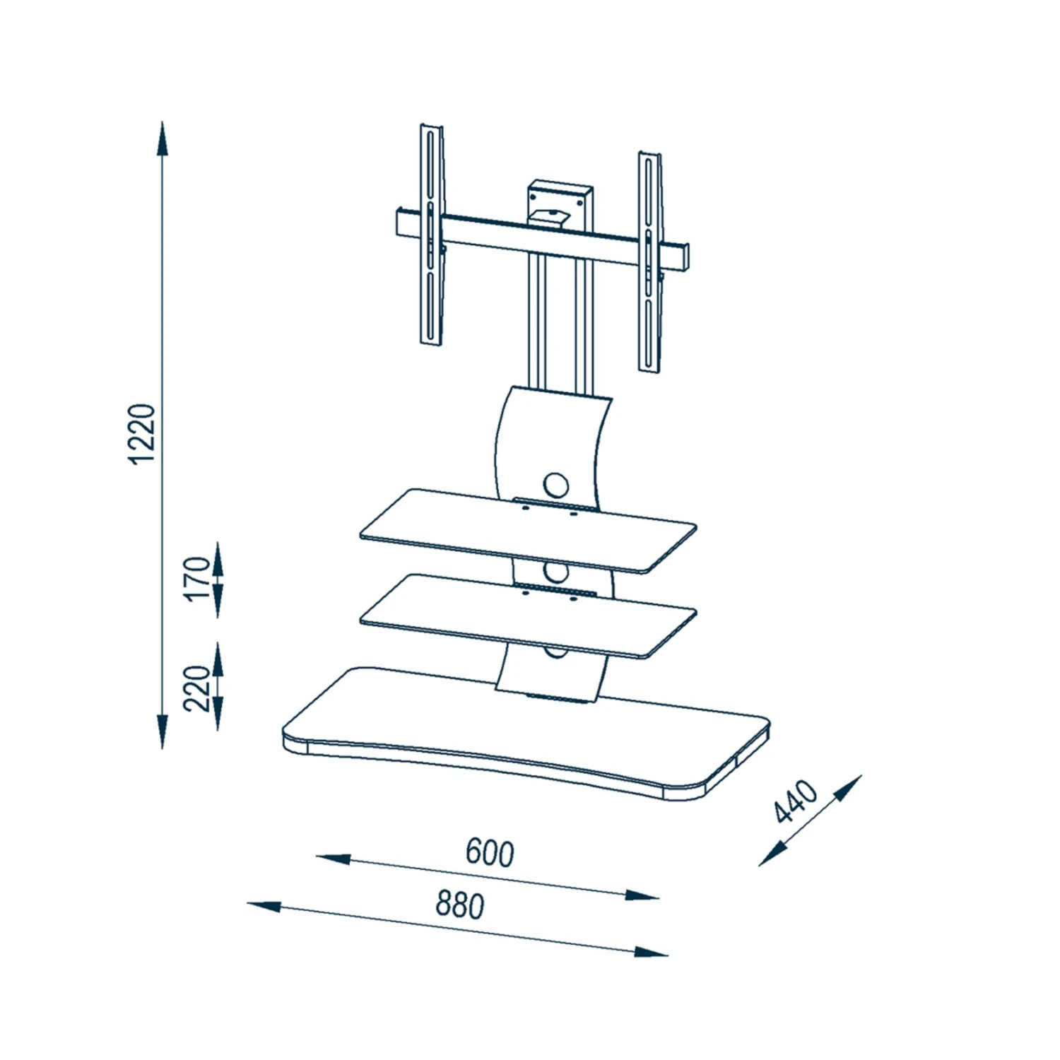 Modernes TV-Rack mit schwenkbarer TV-Halterung bis zu 30°. Es hat ein stylisches und modernes Design, 2 Klarglasböden als Ablage und ist somit perfekt zum Abstellen von Receivern, Spielkonsolen und Abspielgeräten geeignet.