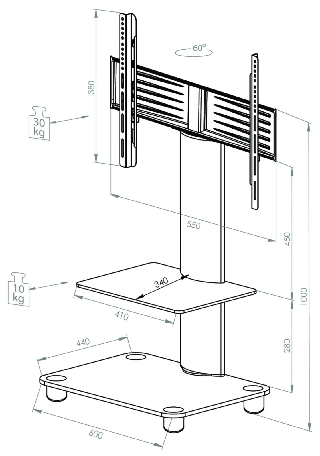 TV-Rack – silber – Mattglas – mit Zwischenboden – für 22-37 Zoll – 60 cm breit