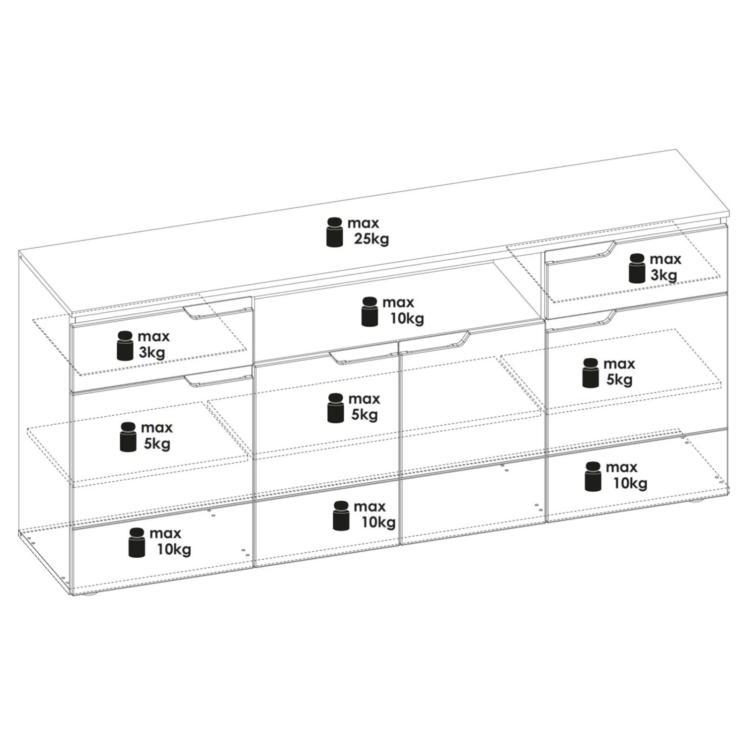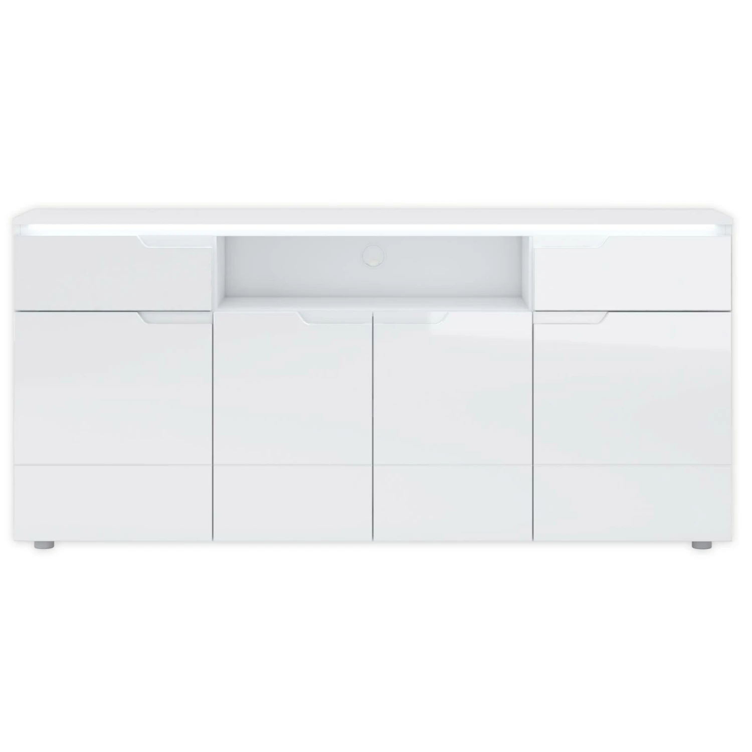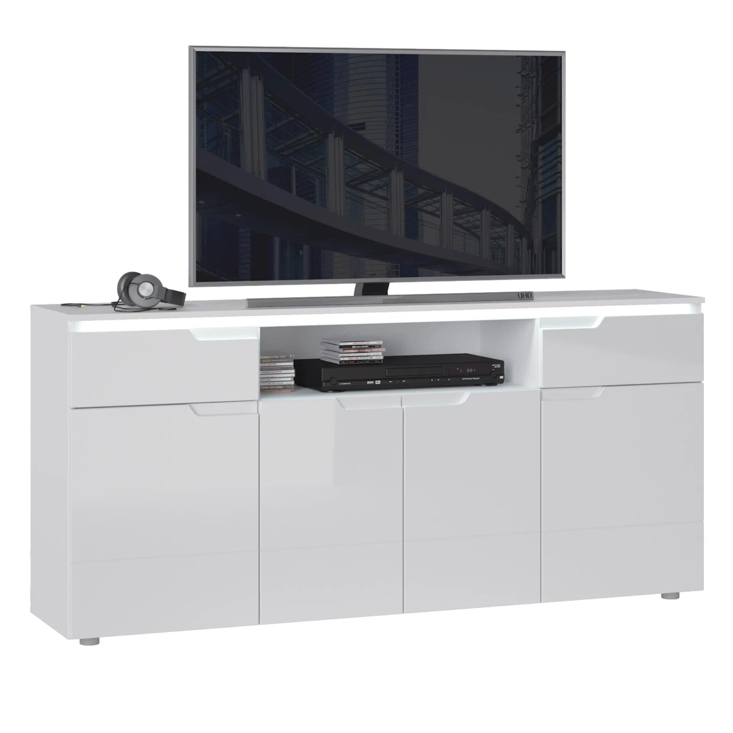 Das etwa 180 Zentimeter breite TV-Sideboard wird in Ihrem Wohnraum ein modernes Ambiente versprühen! Die weiße Farbgebung lässt sich mit den unterschiedlichsten Einrichtungsstilen kombinieren und die grifflose und hochglänzende Front ist der Hingucker! Hier können Sie nicht nur Ihr Fernsehgerät platzieren, zudem bietet das Sideboard auch reichlich Platz für die verschiedensten Gebrauchsgegenstände. Diesen Stauraum finden Sie hinter vier Türen und in zwei geräumigen Schubkästen. Das absolute Highlight ist die Lichtleiste, die an der Front befestigt wird.