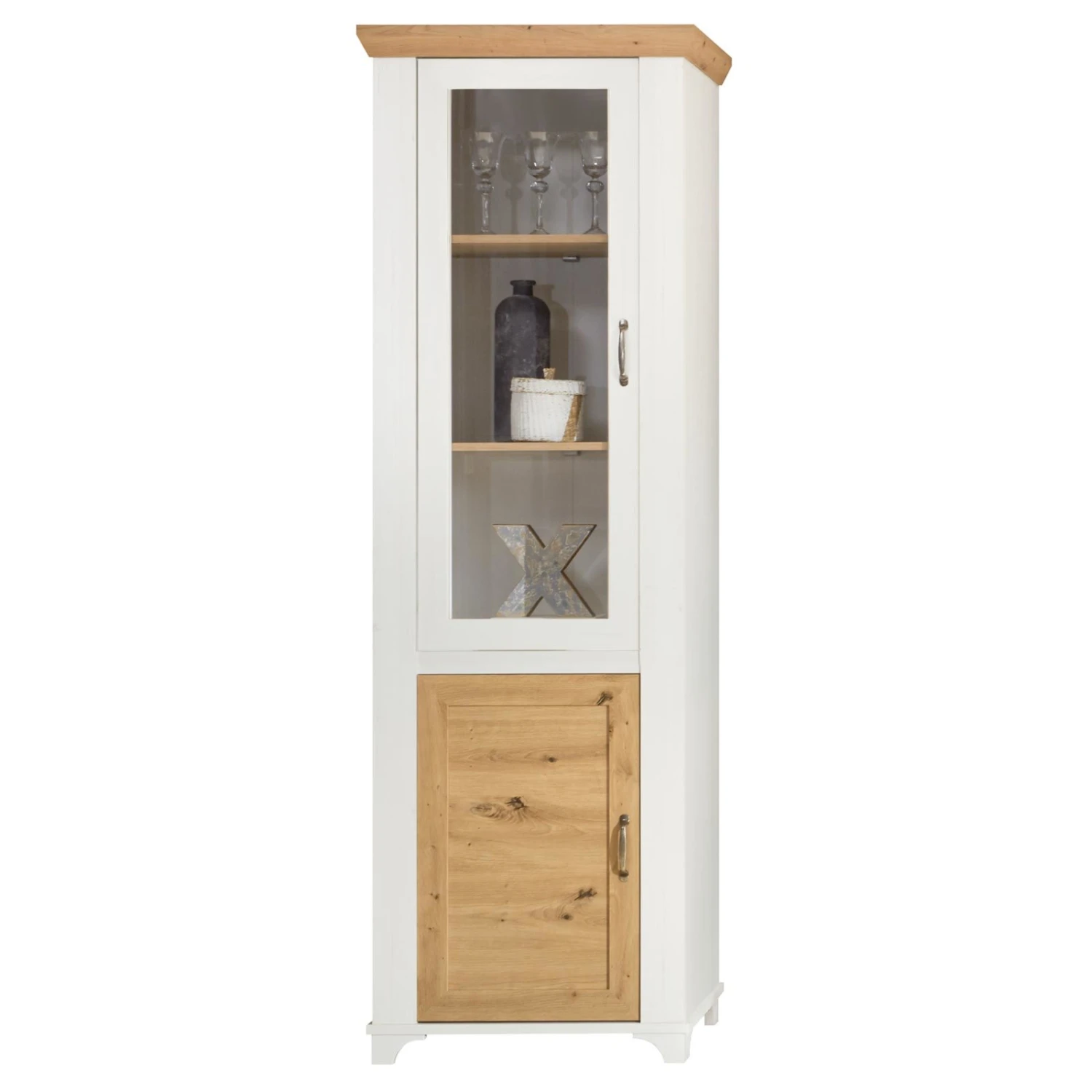 Hinter zwei Türen bietet diese etwa 201 Zentimeter hohe Vitrine Platz für viele Gebrauchsgegenstände und Dekorationen. Sie können Ihre Utensilien sichtbar hinter der Glastür in Szene setzen oder nicht sichtbar hinter der Holztür unterbringen. Das landhäusliche Design wird ein gemütliches Ambiente in Ihrem Wohnbereich versprühen und der Mix aus Anderson Pine und Artisan Eiche Nachbildung lässt sich mit den verschiedensten Einrichtungsstilen kombinieren.